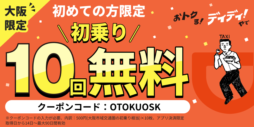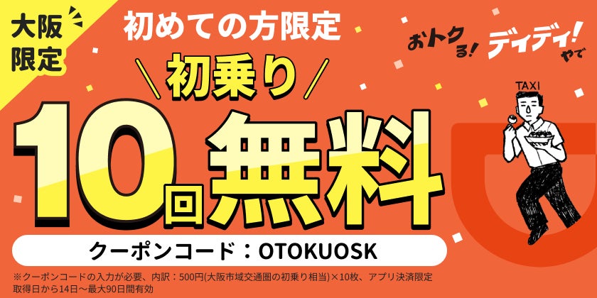 DiDiモビリティジャパン株式会社(本社:東京都港区、代表取締役社長:和久山 大輔、以下「ディディ」)は、2024年7月4日(木)より、大阪エリアにおいて「おトクる!ディディ!やで」キャンペーンの第一弾として、初めてディディをご利用の方を対象に、大阪市域交通圏の初乗り料金相当(500円)が10回分無料になるキャンペーンを開始します。対象の方がアプリ内で所定のクーポンコードを入力すると、500円オフのクーポンが10枚付与されます。