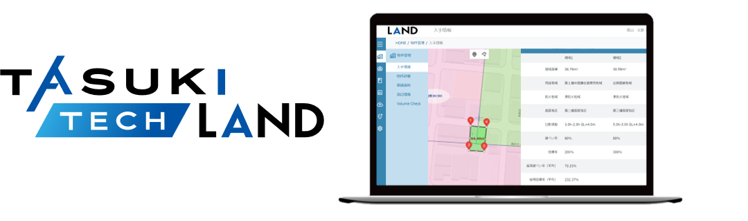 「TASUKI TECH LAND」は、これまで不動産業界内において、紙ベースによる管理が一般的だった土地所有者や仲介事業者から提供される土地情報を、不動産業を営む企業がPCやスマートフォンからクラウド上で一元管理・運用ができるSaaS型サービスです。すべての仕入情報をクラウドで管理することで、業務効率化が可能です。