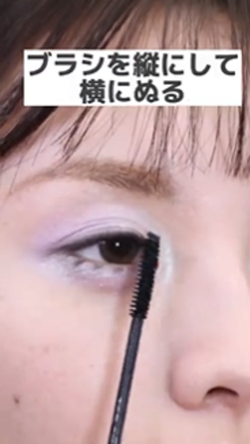 マスカラを縦にして毛束感のあるまつ毛に。根元からまつ毛全体に液を付けるように、毛流れに合わせてまとめるのがポイント!