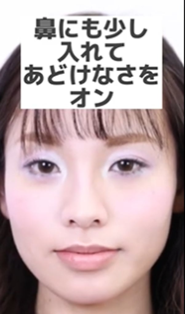 チークは横長に入れて、キュートな印象に。さらに鼻にも同じカラーのチークを入れることで、顔全体の血色も良く見え、あどけなさも演出します。
