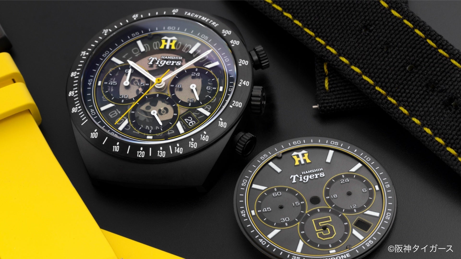 カスタマイズできる阪神タイガースとのコラボウォッチ。マットブラックのトノーケースに最適な2つのベルト(コーデュラブラック・ラバーイエロー)を付属。3つのサブダイアルがスポーティな印象を表現し、6時位置の秒針部分には阪神タイガースの背番号を選んで入れることも可能。サファイアガラスを採用した100M防水ウォッチとなっています。