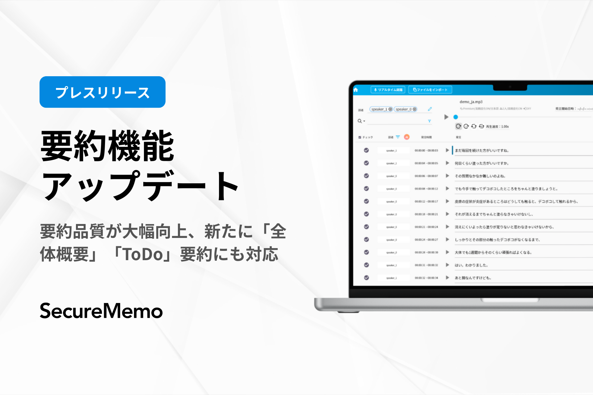 従来、「SecureMemo」ではAIによる自動文字起こしと、トピック別・決定事項の要約機能を提供していましたが、今回のアップデートにより、会議内容の全体像を俯瞰できる「全体概要」、および実務アクションを明確にする「ToDo」要約が追加されました。これにより、より実践的で活用度の高い議事録生成が可能となります。