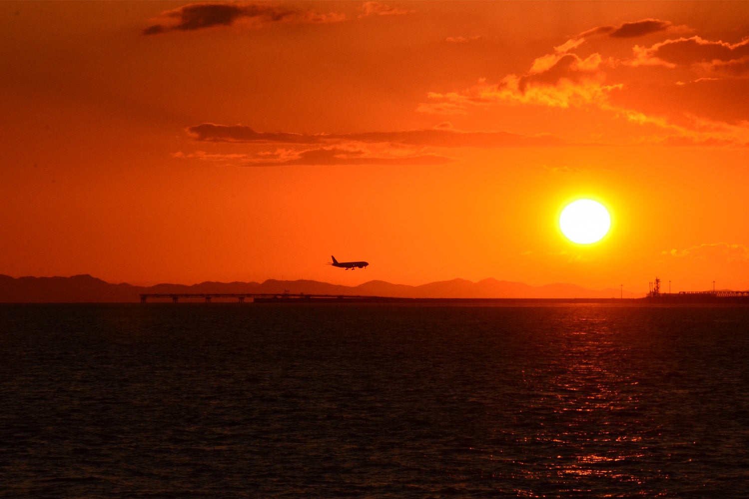 ①大阪一円の夜景。日本夕陽百選の夕日。色鮮やかな大阪湾の情景を臨む展望緑地