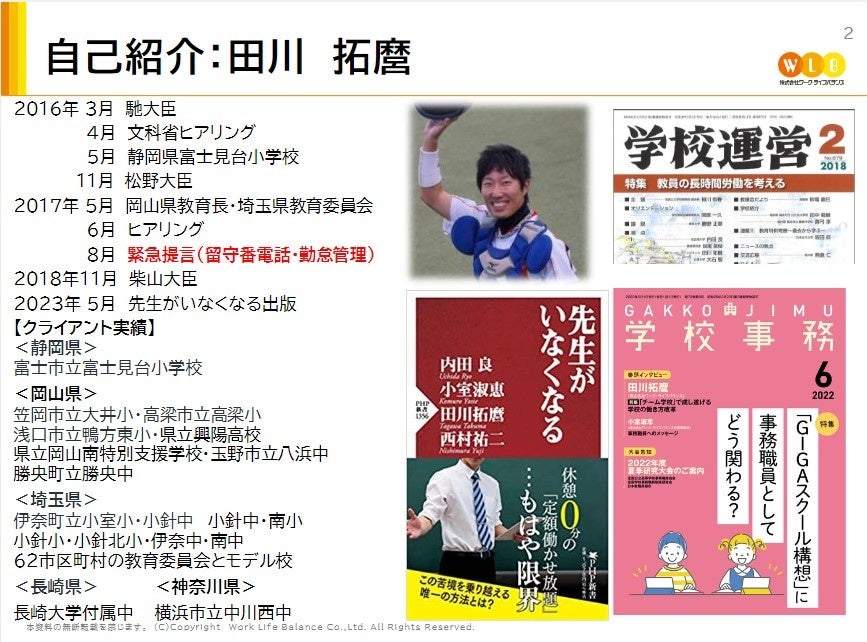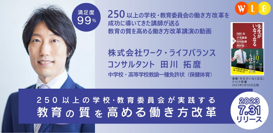 本動画コンテンツはオンデマンドで配信され、1か月の残業時間数が国の上限として示している月45時間を中学校で77.1%、小学校では64.5% を超えるとみられる 働き方[注1] の多忙な教員がいつでも・どこでも視聴できるものです。講師は、教育機関での講演研修等を延べ250以上担当・これまでの聴講者数1万人を超え、2023年5月16日に「先生がいなくなる」(PHP新書)を刊行した当社コンサルタント・田川拓麿(たがわたくま)が担当し、教職員の意識改革や働き方改革に効果のある朝メールドットコムⓇやカエル会議Ⓡ に加え、残業時間を約5割削減した岡山県高梁市立高梁小学校の事例などを紹介します。