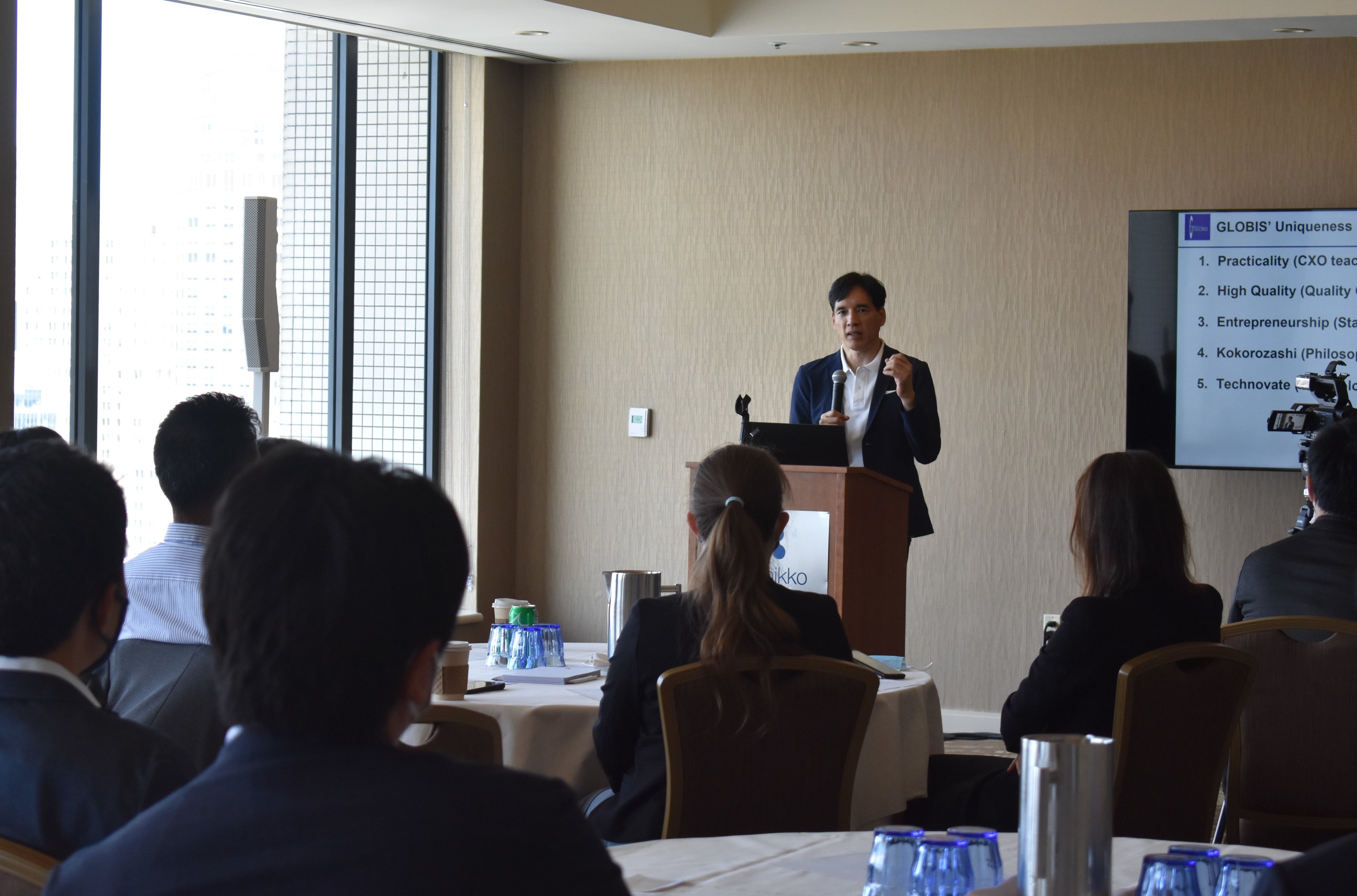 GLOBIS USAは、昨年4月に設立し、米国初の拠点として、米国内で事業を展開する日本企業に対し法人研修や定額制動画学習サービス「GLOBIS Unlimited」のサービスを提供、またビジネスパーソンを対象としたオンラインでのマネジメント講座(Pre-MBA)を開講してきました。今回、堀のGLOBIS USA訪問を機会として、初めてサンフランシスコでリアル・オンラインのハイブリッド形式でセミナーを開催し、「テクノベート時代の世界No.1 MBAプログラムを目指して」と題して講演を行いました。会場には、グロービスの米国展開へ期待を寄せる多くの関係者・受講生・卒業生が集まり、交流を行いました。また、セミナーの開催後には、全米の英語MBAプログラムの卒業生を対象としたアルムナイチャプターを設立しました。