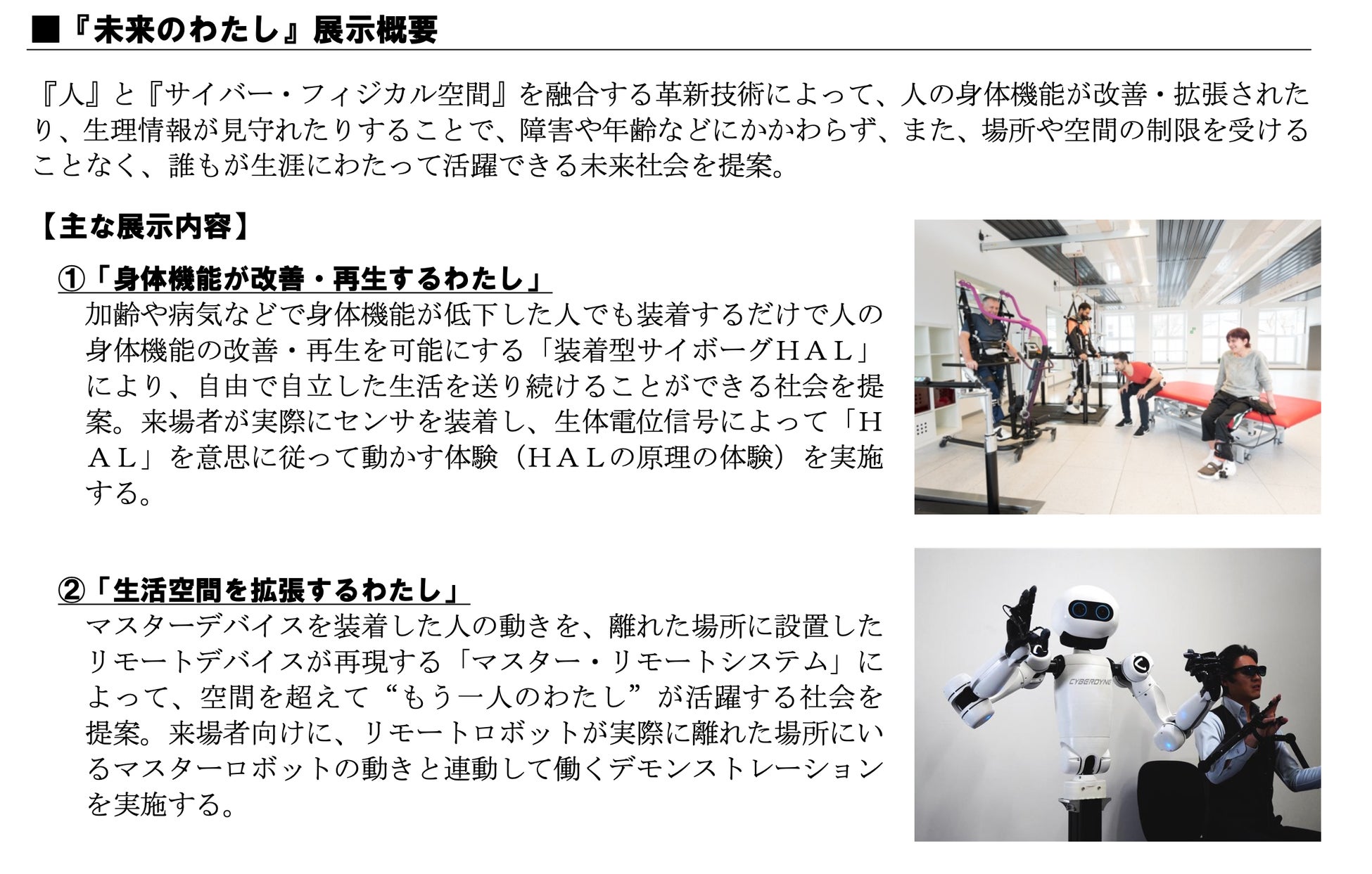 同展示は3つのテーマで構成。①「身体機能が改善・再生するわたし」では、自身の意思に従った動作を実現する世界初の装着型サイボーグ「HAL(ハル)」などにより、加齢や病気等によって低下した身体機能を改善・再生することができる社会を提案。②「生活空間を拡張するわたし」では、マスター・リモートシステムという遠隔技術によって“もう一人のわたし”が活躍することで、場所や空間に縛られない生き方や働き方が実現する社会を提案。そして、③「安心して見守られるわたし」では、自身のバイタル情報を読み取る小型センサーによって、健康状態の変化を常に検知することができる社会を提案します。