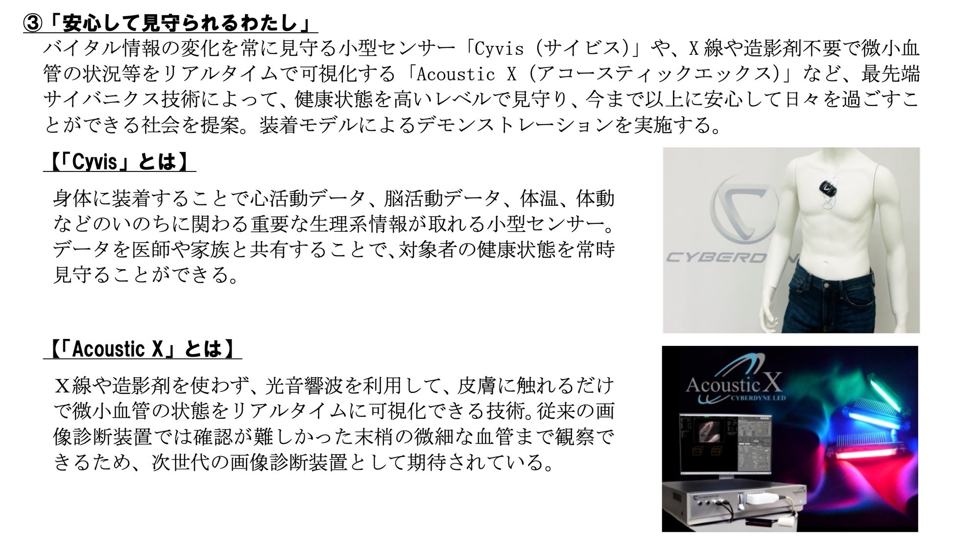 そして、同パビリオンの「からだゾーン」において、パソナグループとCYBERDYNE株式会社(本社:茨城県つくば市、代表取締役社長 山海嘉之)は共同で、人とサイバー・フィジカル空間(※1)が融合し、人とAI・ロボットが協調する未来社会を表現する『未来のわたし』に関する展示を行ってまいります。