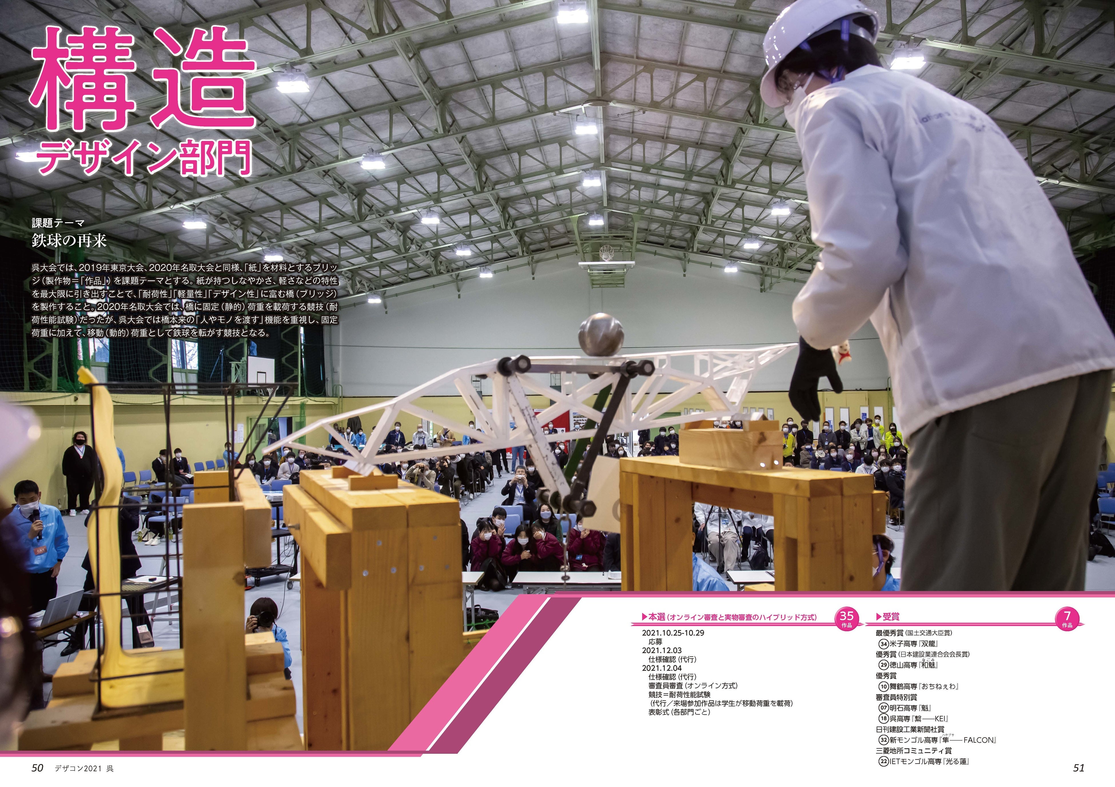 『紙』を材料とするブリッジの製作が課題。『紙』の特性を最大限に引き出し、「耐荷性」、「軽量性」、「デザイン性」に優れた構造のブリッジであることが求められた。全国及びモンゴルから応募された35作品の、ブリッジへの固定(静的)荷重の載荷と移動(動的)荷重として鉄球を転がす競技(耐荷性能試験)の様子など、全作品の総合順位と入賞作品が決定するまでの全審査過程を記録する。