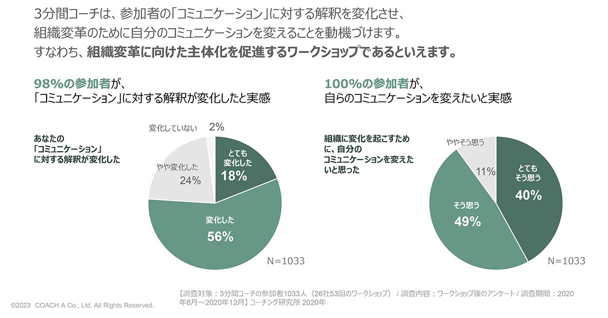 株式会社コーチ・エィ(代表取締役社⻑:鈴⽊義幸)は、2020年に提供を開始した「3分間コーチ」のコンテンツを刷新し、対話型組織開発の側面を強化しました。
