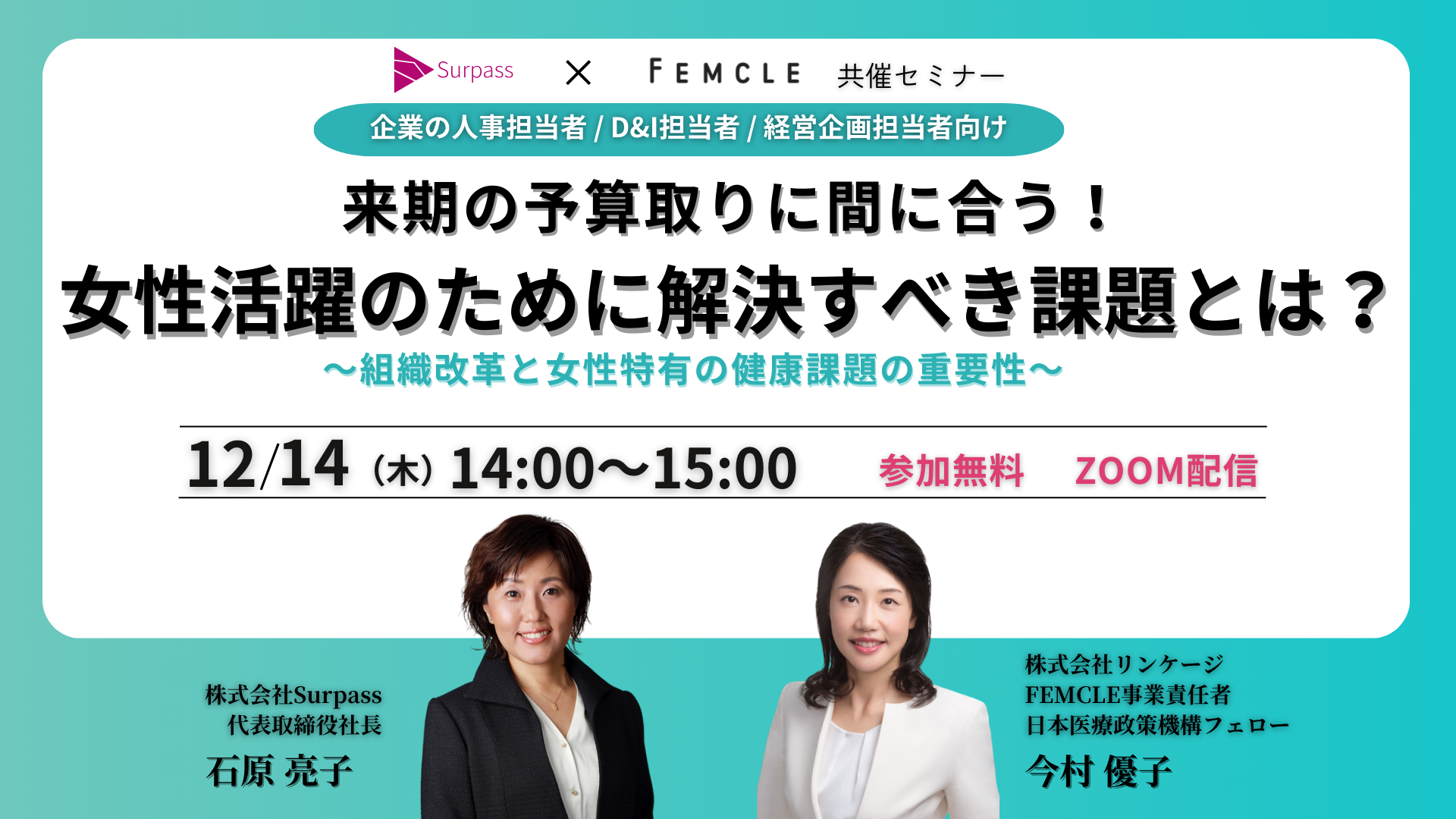 登壇するのは、日本医療政策機構フェローで、株式会社リンケージのFEMCLE事業責任者でもある今村 優子と、株式会社Surpassの代表取締役社長 石原 亮子氏です。無料でご参加いただけるセミナーです。ぜひお申し込みください。