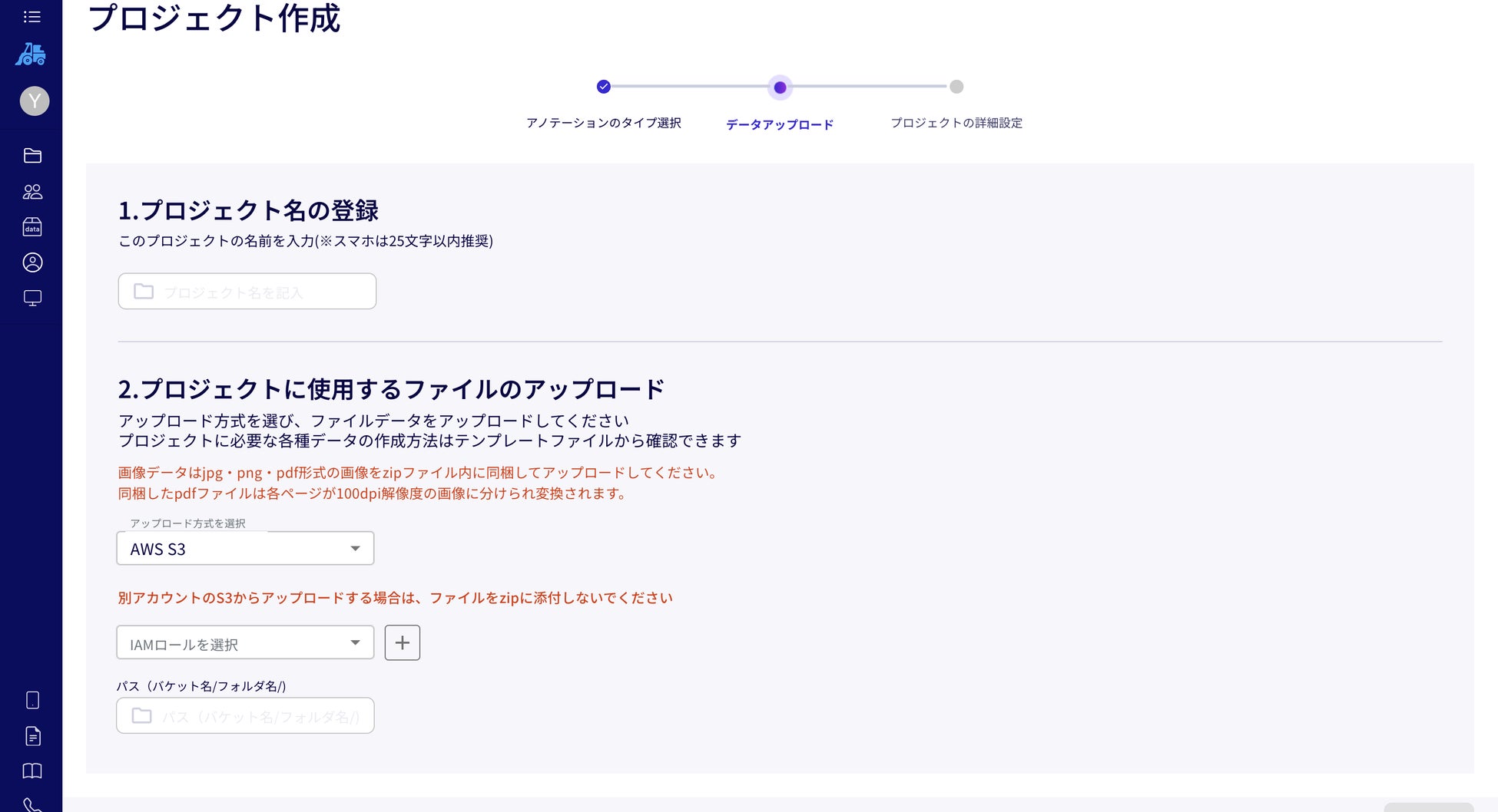 プロジェクト作成時の、ファイルアップロード画面の際に、ローカルでのアップロードとご用意いただいたAWS S3のバケットからのアップロードを指定することができます。