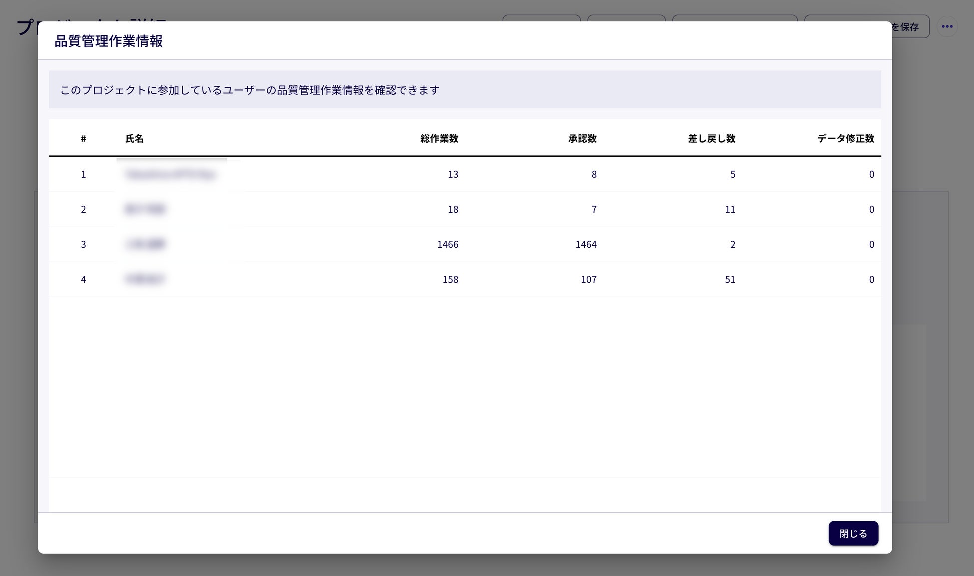 プロジェクト詳細画面の右上に「品管作業情報」というボタンが追加されており、このボタンを押すことで組織に参加しているユーザー毎の品管作業情報が閲覧できます。この画面を元に品管作業分担と作業進捗の把握をより行いやすくなるようになっております。