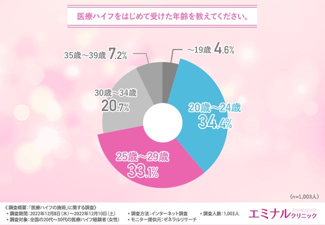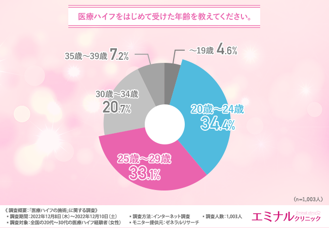 「医療ハイフをはじめて受けた年齢を教えてください。」と質問したところ、『~19歳(4.6%)』『20歳~24歳(34.4%)』『25歳~29歳(33.1%)』『30歳~34歳(20.7%)』『35歳~39歳(7.2%)』という回答結果になりました。
