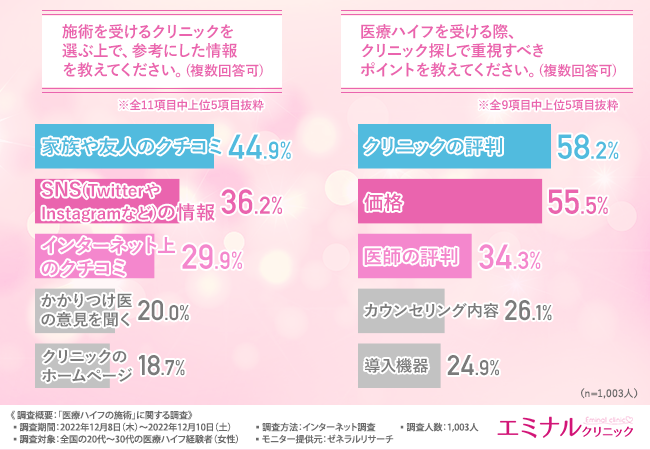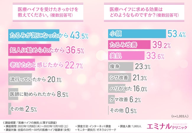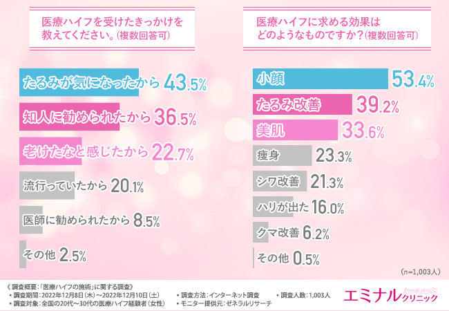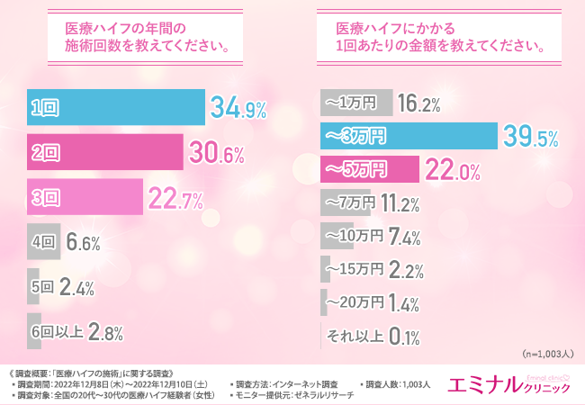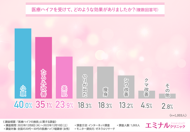 そこで今回、医療ハイフを手掛けるエミナルクリニック(https://eminal-clinic.jp/hifu/?refmedia=A-40039)は、全国の20代~30代の医療ハイフ経験者(女性)を対象に、「医療ハイフの施術」に関する調査を実施しました。