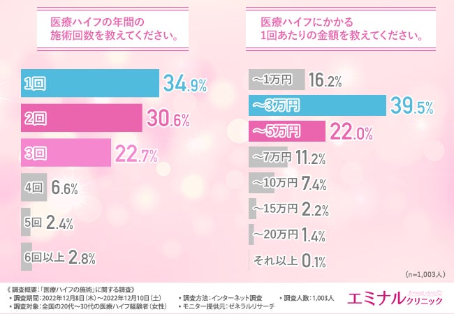 【医療ハイフの施術に関する調査】9割近くの方が年間の施術回数が1~3回と回答。1回あたりにかかる金額とは?