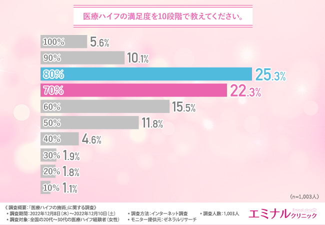 「医療ハイフの満足度を10段階で教えてください。」と質問したところ、『80%(25.3%)』と回答した方が最も多く、次いで『70%(22.3%)』『60%(15.5%)』と続きました。