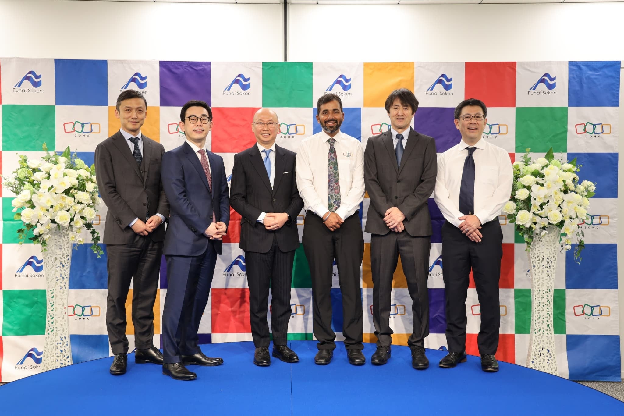 左から船井総合研究所 取締役専務執行役員 出口恭平、船井総合研究所 代表取締役社長 真貝大介、船井総研ホールディングス 代表取締役社長 グループCEO 中谷貴之、Zoho Corporation Pvt. Ltd Harish Sekar氏、ゾーホージャパン 取締役社長 大山一弘氏、ゾーホージャパン Zoho事業部 事業部長 中沢仁 氏