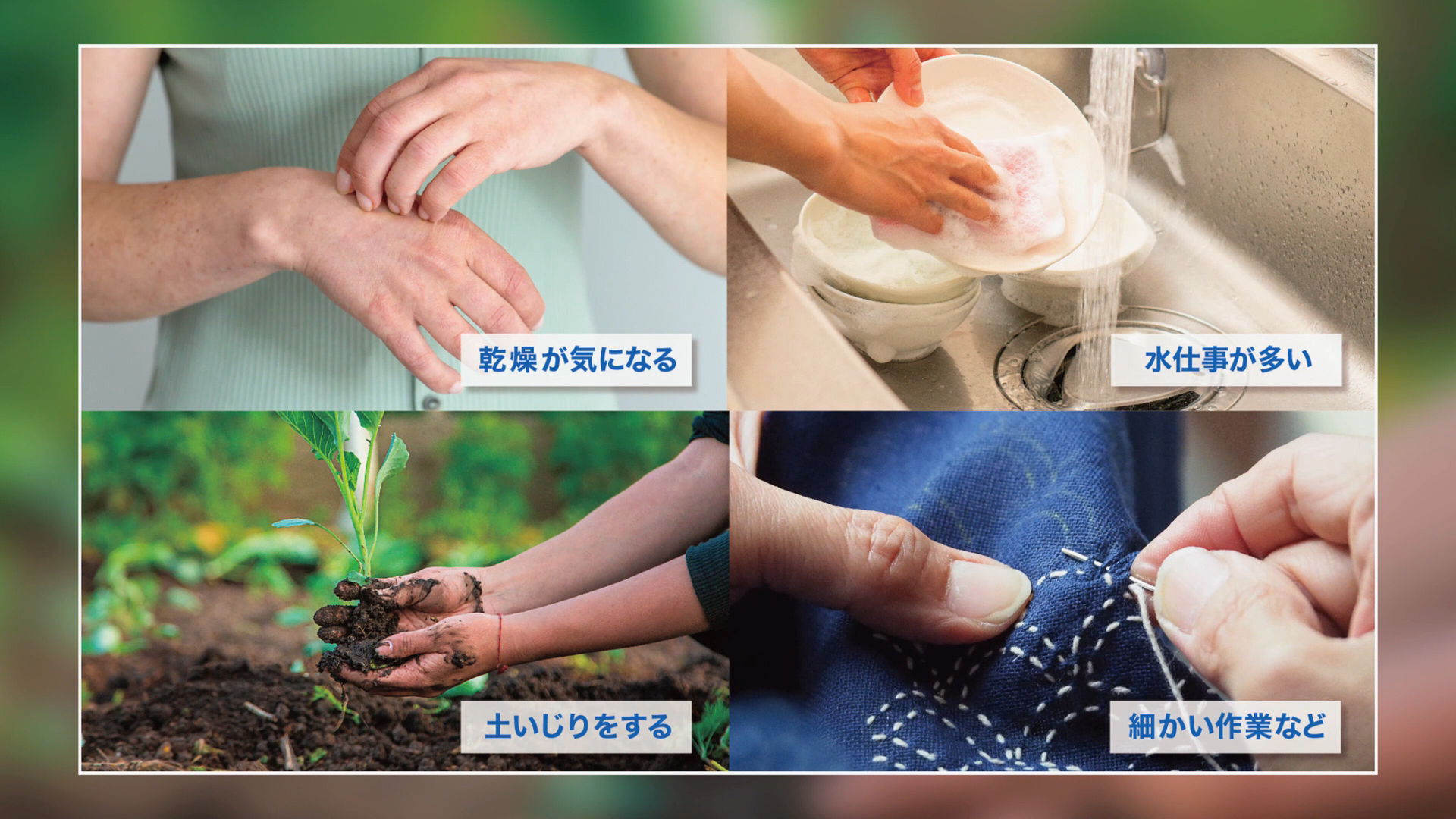この保護膜は機械油・薬剤・繰り返すアルコール消毒といった刺激から肌をガードし、さらに家事や水仕事、育児など、日常生活で起こるさまざまな手荒れ要因からも長時間手肌を保護します。