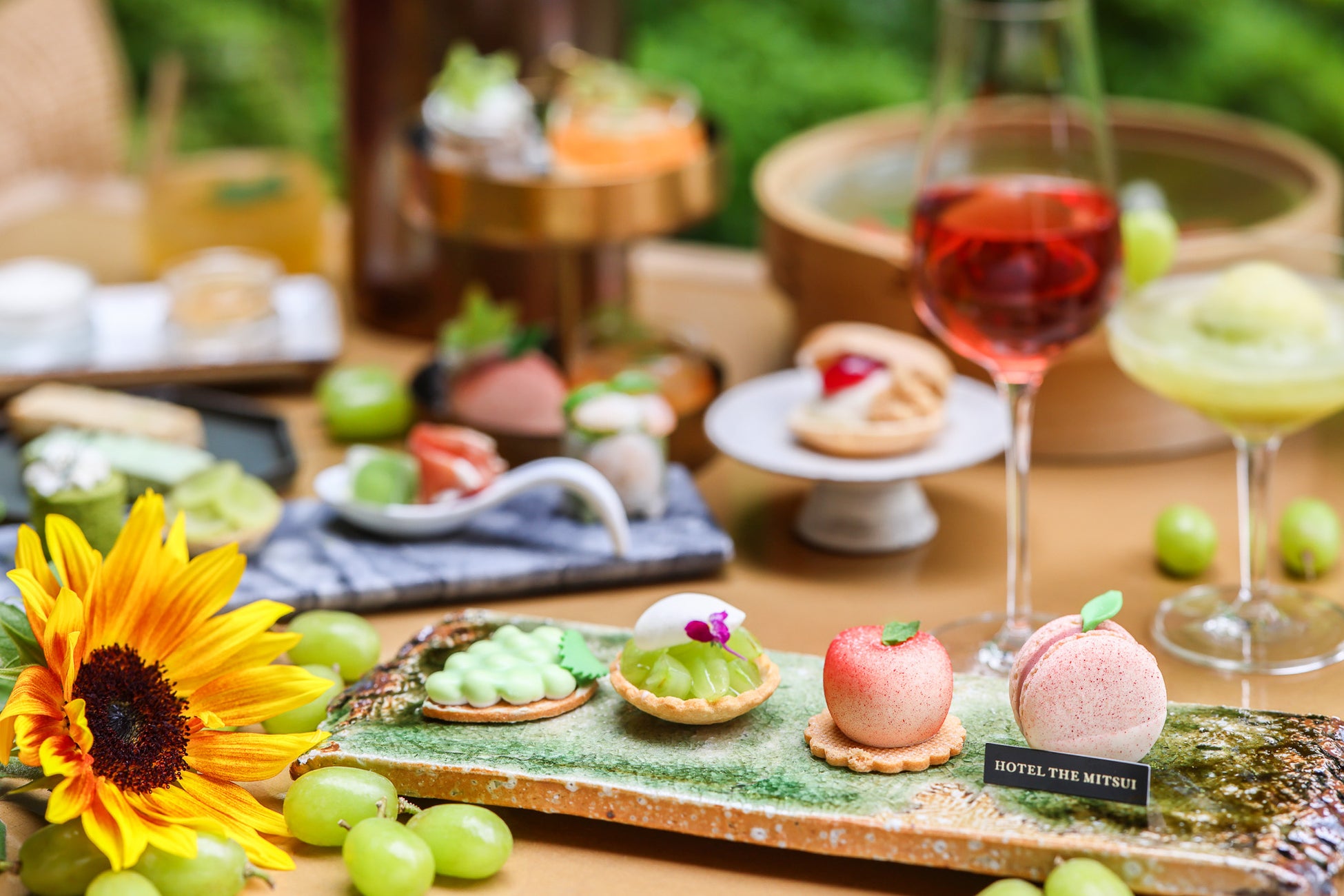京都・元離宮二条城前、三井総領家邸宅跡地に佇むHOTEL THE MITSUI KYOTO(ホテル ザ ミツイ キョウト https://www.hotelthemitsui.com )(所在地:京都府京都市中京区油小路通二条下る二条油小路町284 総支配人:楠井 学)のバー&ラウンジ「THE GARDEN BAR」では、2025年7月14日(月)より旬を迎える果実の瑞々しさをお愉しみいただける「シャインマスカット&桃 アフタヌーンティー」をご提供いたします。