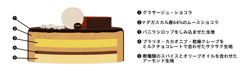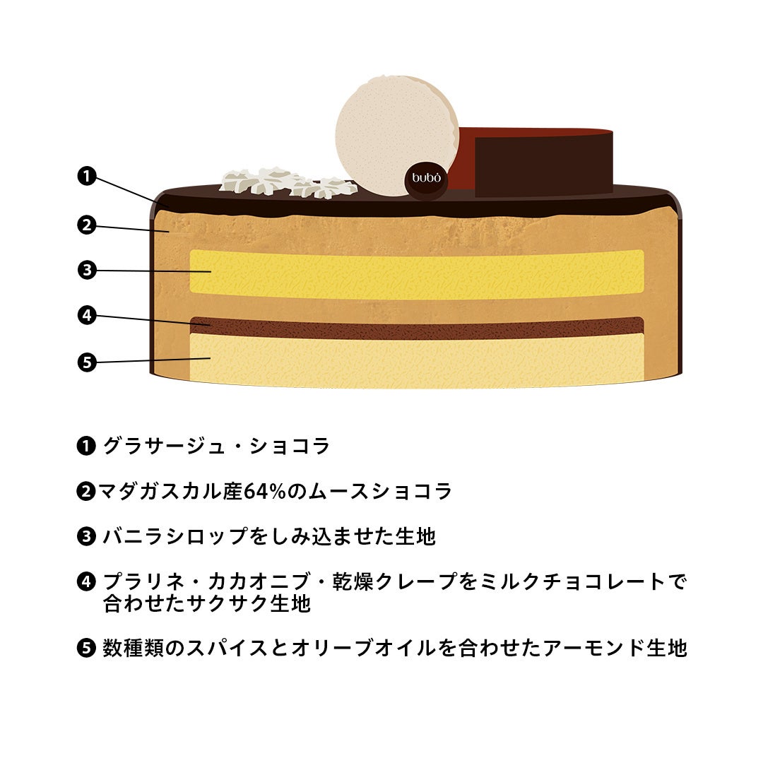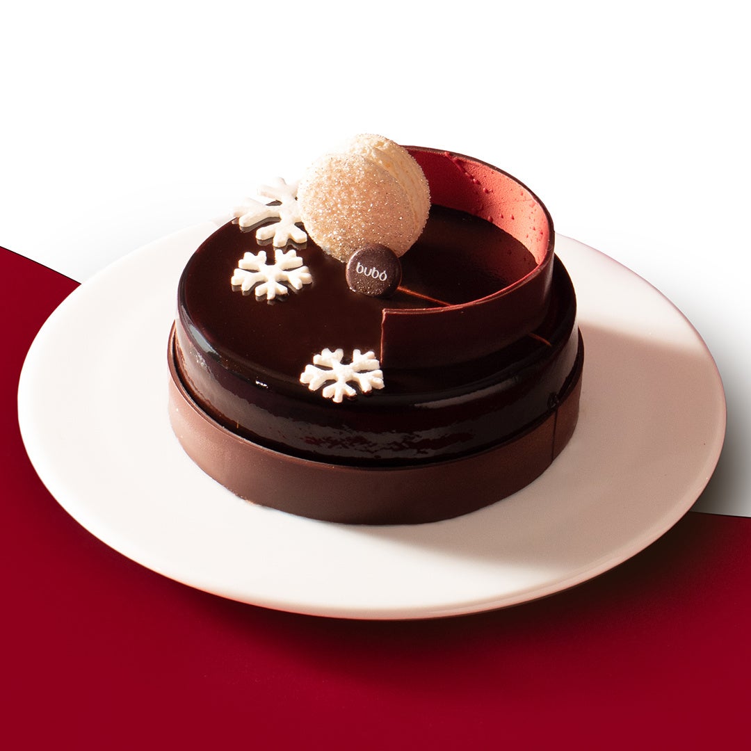 ブボ・バルセロナを代表する「シャビーナ」に、雪の結晶と煌めくバニラマカロンをあしらった数量限定のクリスマスケーキ。大切な人と過ごすとっておきの時間に輝きを添える、特別なデザインです。シナモン、ナツメグ、クローブ、5種の黒コショウなど数種類のスパイスを使用。オリーブオイルを使用したアーモンド生地、ダークチョコレートのムース、チョコレートプラリネを合わせ、艶やかな美しいチョコレートのグラサージュで他に類を見ない洗練された逸品です。年に一度の特別な一日に、芳醇なスパイスとチョコレートの豊かなマリアージュをお楽しみください。