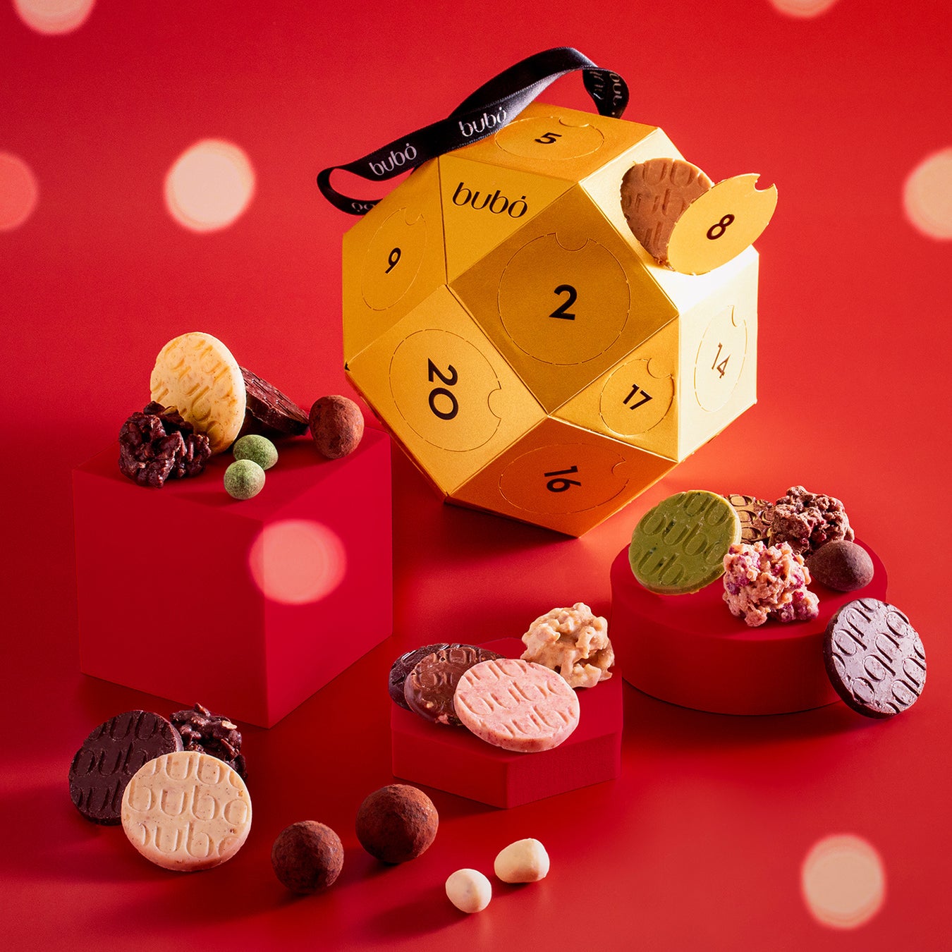 ブボ・バルセロナを代表するチョコレートがたくさん詰まった、ゴールドに煌めくスペシャルなアドベントカレンダー。扉の中には、大人気のチョコフルーツを始め、チョコロックや、マンディアン、チョコレートバーなど、全24種類のチョコレートが入っています。クリスマスのオーナメントをモチーフに、何が出てくるか分からないワクワク感とブボの遊び心を詰め込みました。クリスマスイブまで毎日ひとつずつ扉を開けて、チョコレートとともに特別なカウントダウンを楽しんで。リボンが付いているので、クリスマスツリーやお部屋に飾ってもお楽しみいただけます。大切な方へのクリスマスギフトにもおすすめです。