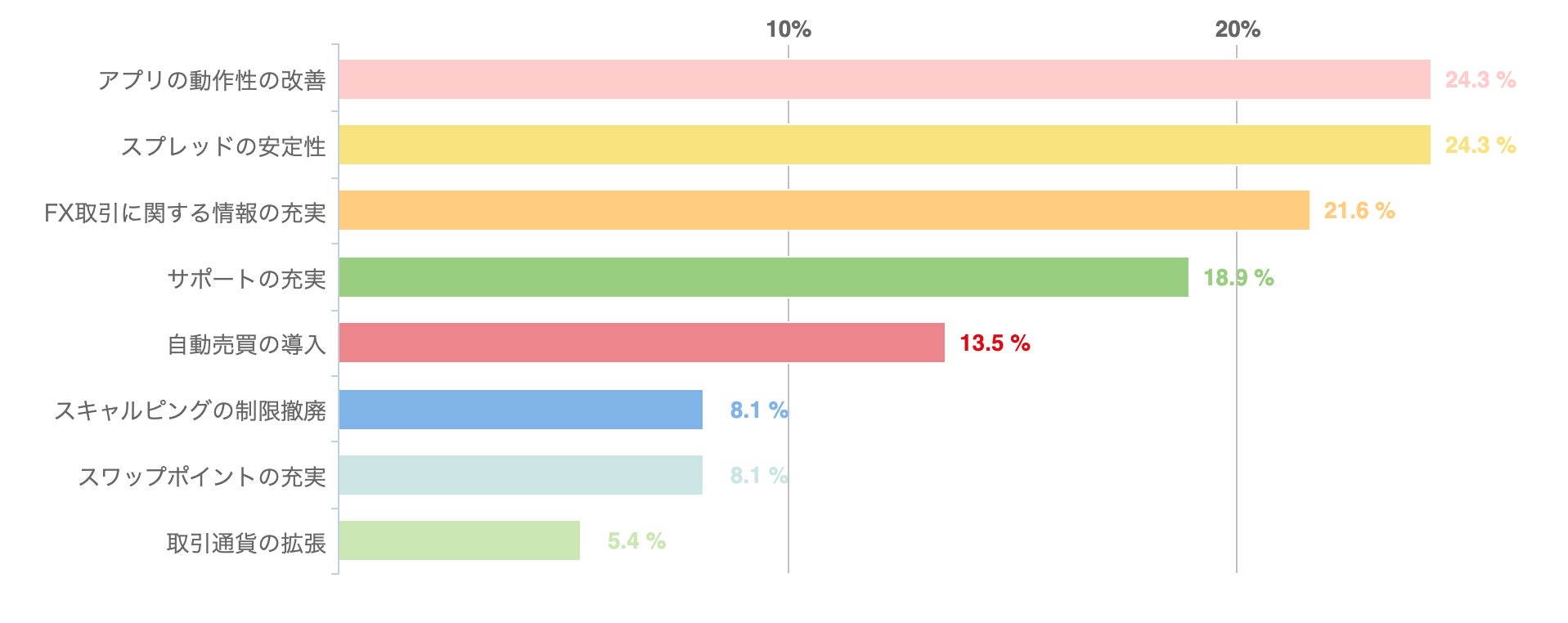 また、「FX取引に関する情報の充実(21.6%)」「サポート体制の充実(18.9%)」「自動売買の導入(13.5%)」を望む意見も一定数見受けられた。具体的には、「投資関係の情報記事をもっと発信してほしい」「コールセンターの受付時間を延ばしてほしい」「手動で取引する時間がないので自動売買を復活させてほしい」といった提案が寄せられた。