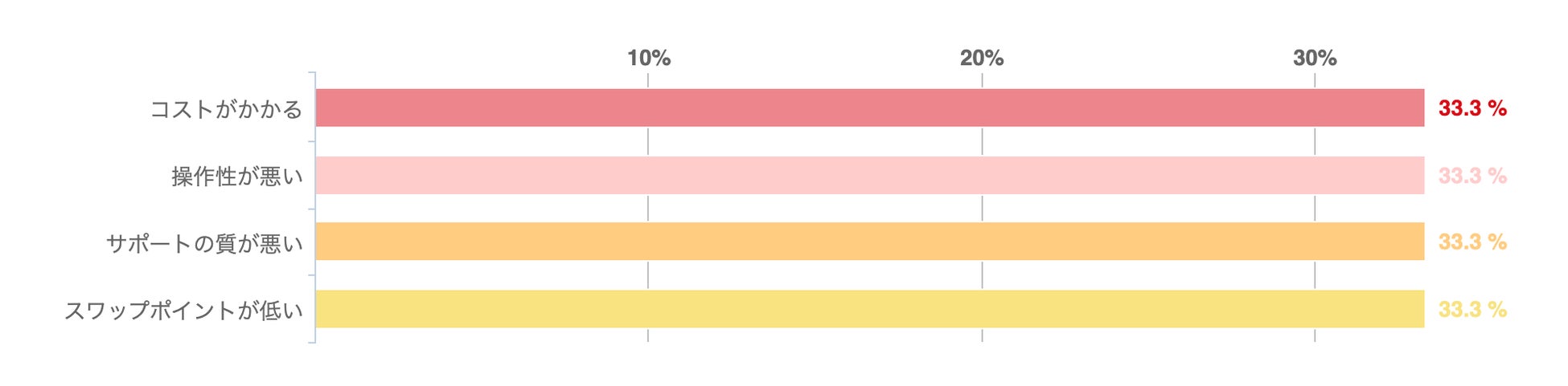 アンケートによれば、FX取引をやめた理由は「コストの高さ」「サイトの操作性の悪さ」「サポート体制への不満」「スワップポイントの低さ」がそれぞれ33.3%で同率となっている。