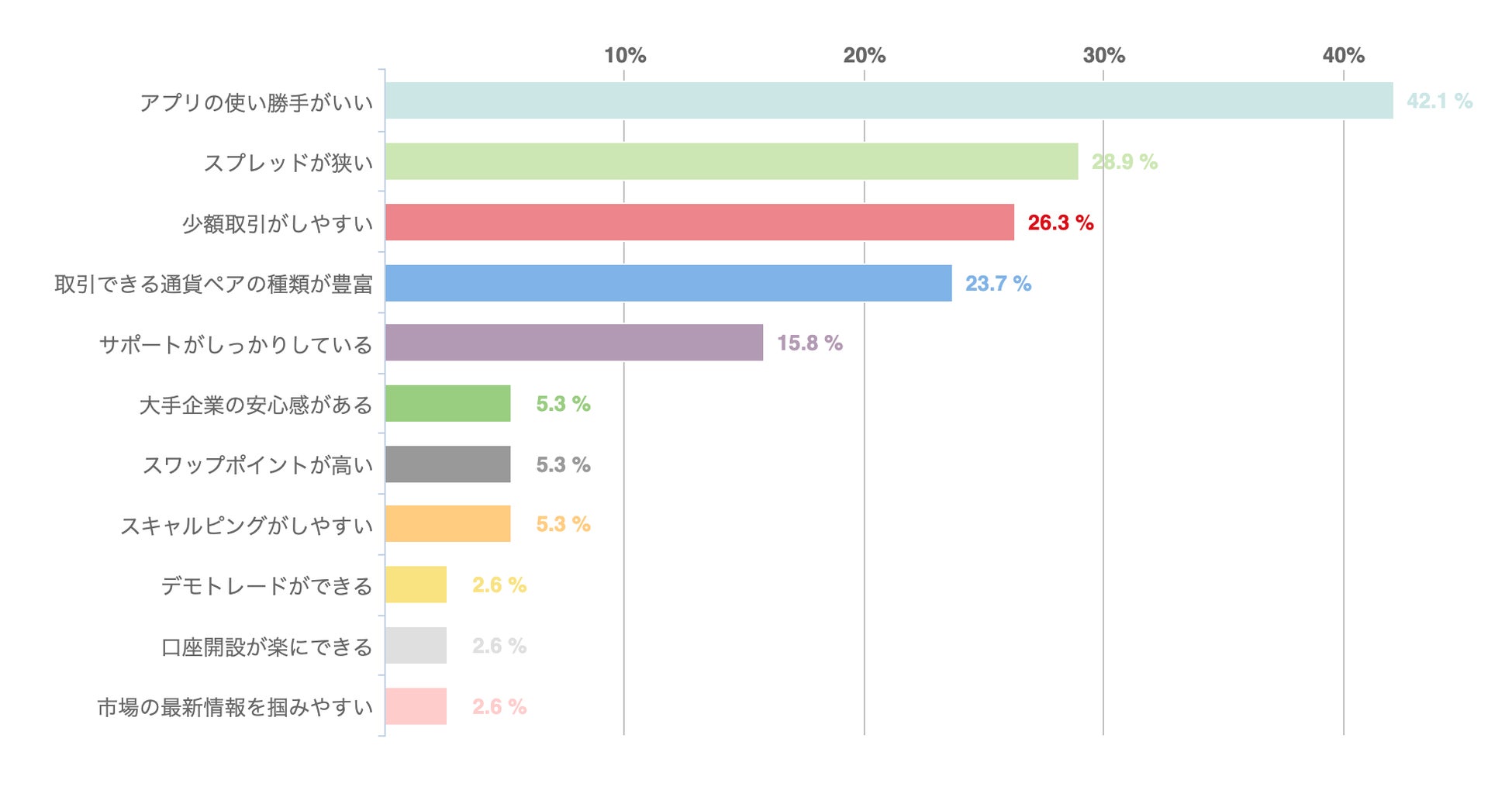 次いで、「スプレッドの狭さ(28.9%)」や「少額取引のしやすさ(26.3%)」がメリットとして挙げられている。この結果により、業界最狭水準のスプレッドや1,000通貨から気軽に取引できる点を投資家が高く評価していることが分かった。