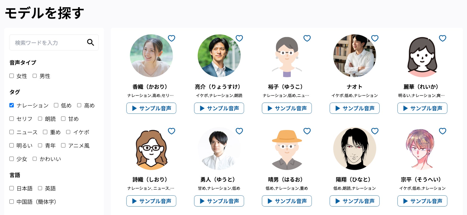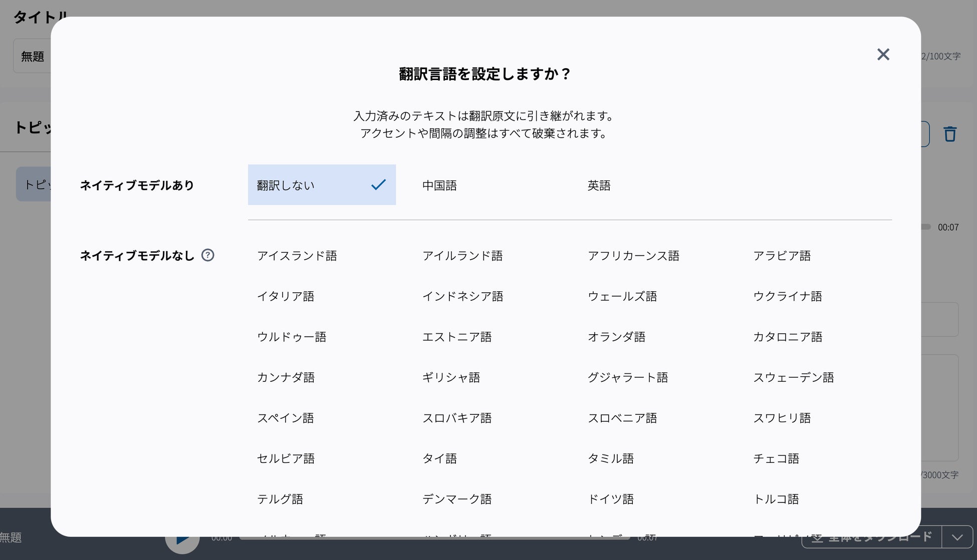 テキスト読み上げ機能では、200以上の豊富な音声モデルの中からイメージにあった声を選ぶことができて、日本語の自然なイントネーションでAI音声を生成することができます。併せて、日本語テキストを外国語に翻訳して読み上げる「翻訳・読み上げ機能」も53ヵ国語対応で提供しています。