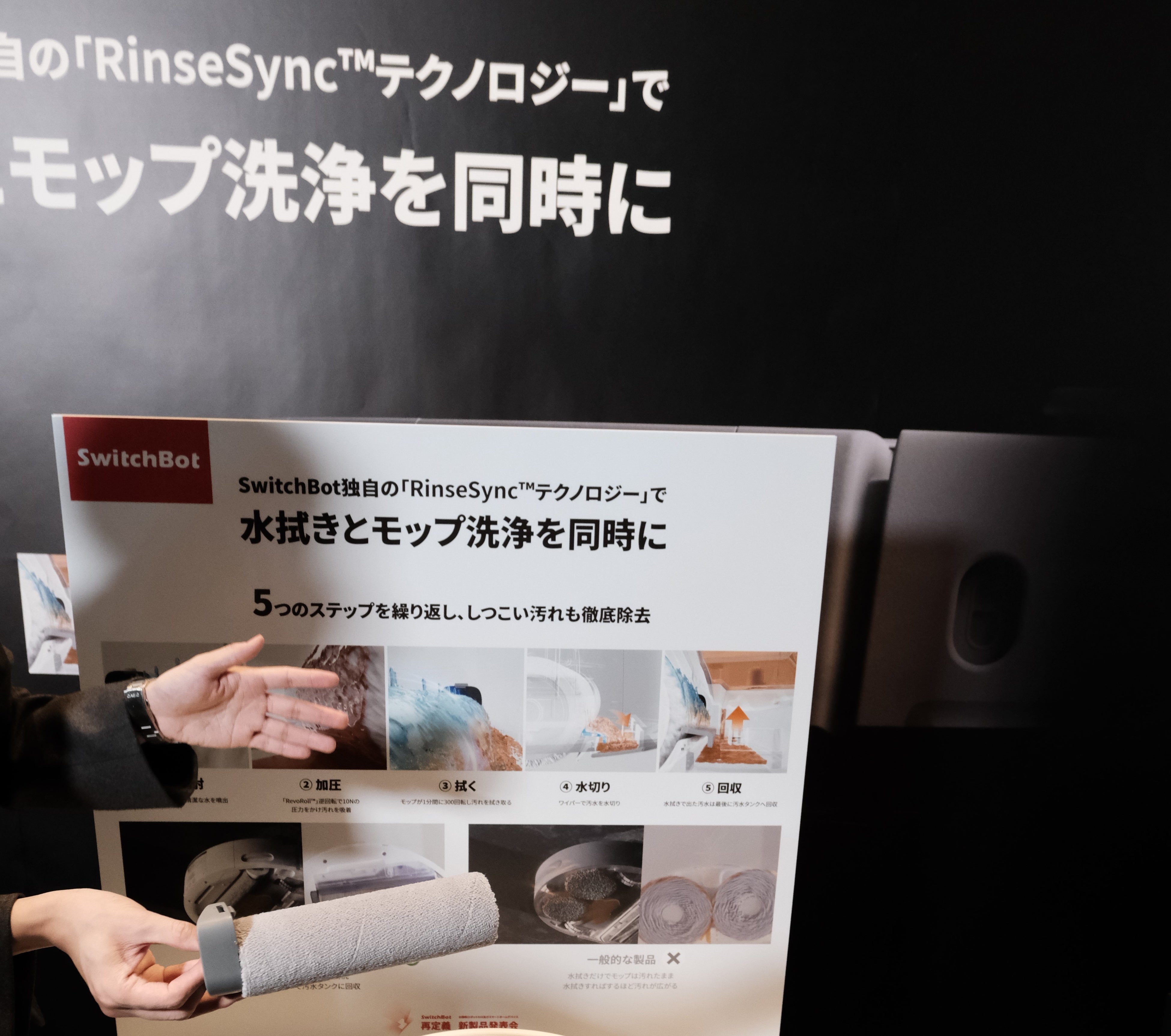 同発表会では、5月15日(水)から正式発売となる「SwitchBot お掃除ロボット」についてご紹介。水道直結により自動給水・排水を叶える水交換ステーションや、水拭きと同時進行でモップの洗浄を行うリアルタイムモップ洗浄技術「RinseSync™」、10Nの圧力で1分間に300回転する「RevoRoll™」、ロボットから水交換ステーションへ給電を行う「EacyCharge™」といった自社発の先端技術の解説をメインに、同製品のプレゼンテーションを行いました。また、5月21日(火)より販売開始予定の新製品「学習リモコン」をはじめ、近日発売予定の「気化式加湿器Plus」「スマートトラッカーカード」など「S10」を含めた計4つの新製品を発表し、製品展開の背景やブランド理念、今後の展望についても言及。質疑応答タイムや実機に触れていただけるタッチ&トライコーナーなども設け、会場は大盛況のうち幕を閉じました。