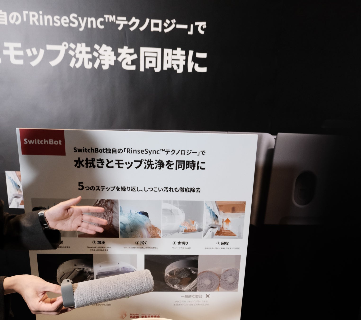 実際に実機に触れていただけるタッチ&トライのコーナーもご用意。タッチ&トライのコーナーでは、水道直結による自動給水・排水の仕組や取り付け方をご覧いただけるよう、SwitchBot社員が実際に使用している洗濯機を会場へ持ち込み、洗濯機とS10を使ったデモンストレーション(※)を行いました。また、自社開発の新技術、水拭きと同時進行でモップの洗浄を行うリアルタイムモップ洗浄技術「RinseSync™」の実演も行い、特にコーラを使った「RevoRoll™」の実演では、「水の噴射→加圧→拭く→水切り→汚水の回収」を繰り返すことで、液体汚れもしっかり落ちることを示し、多くのゲストが興味を示しました。