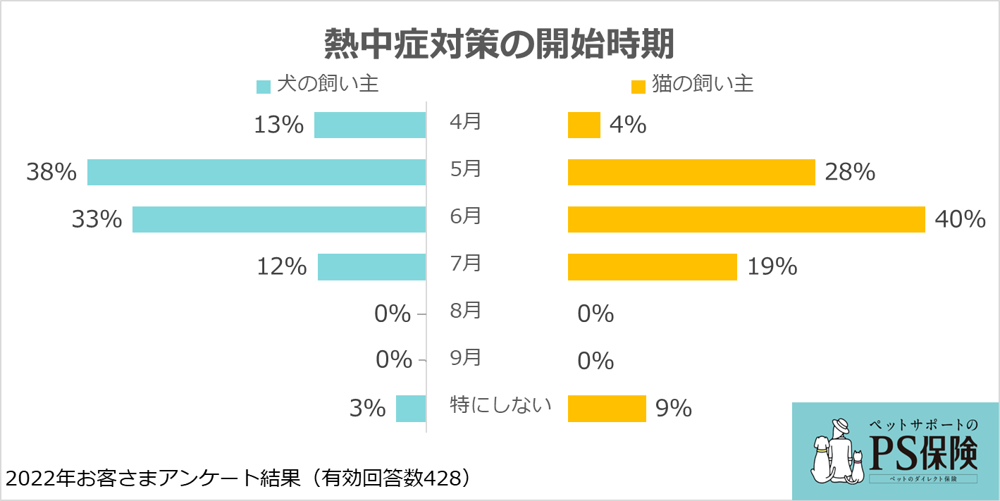 ペットの飼い主に、愛犬、愛猫それぞれの熱中症対策を始める月をたずねたところ、次のような結果になりました。