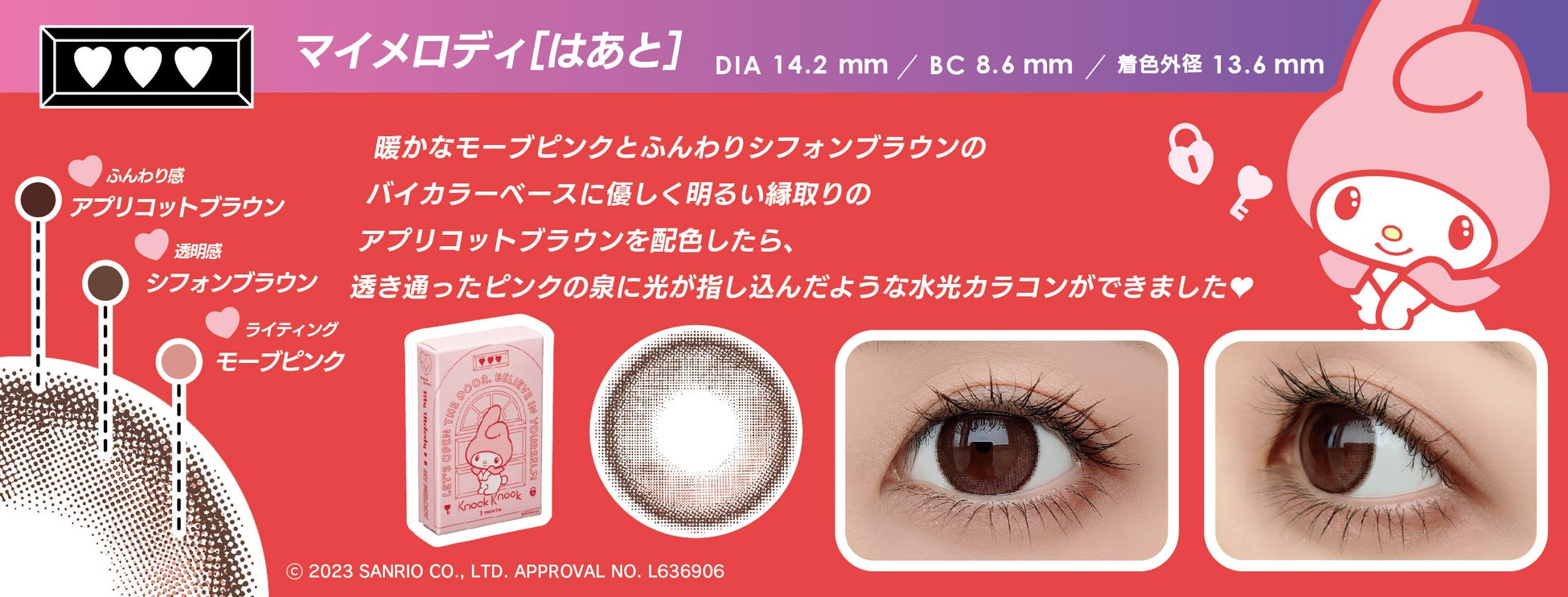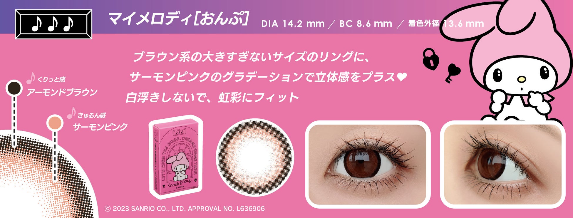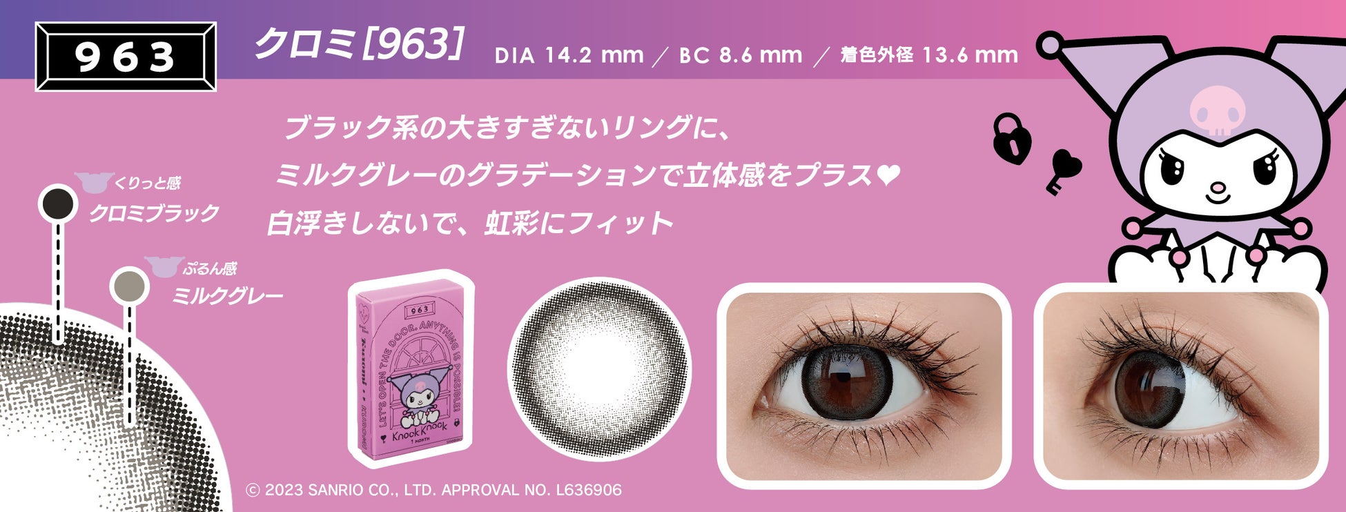 化粧雑貨、化粧品、服飾雑貨、及びキャラクター雑貨等の企画・製造・販売、コンタクトレンズの企画・販売を行う粧美堂株式会社(本社:東京都港区、代表取締役社長:寺田正秀、以下粧美堂)は、コンタクトレンズブランドKnock Knock(ノックノック)と株式会社サンリオのキャラクター「クロミ」「マイメロディ」コラボシリーズ、1month タイプのカラーコンタクトレンズ4 種を、2023 年1 月25 日に発売いたします。