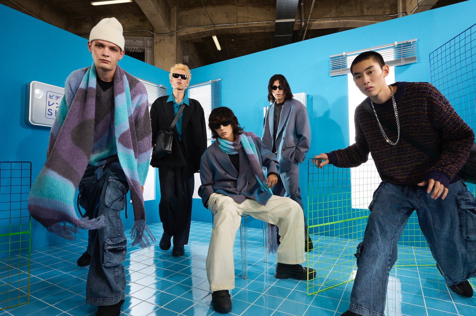 メンズウェアの提案では、テーラリングとミリタリーの要素を組み合わせ、特にアウターウェアやトップスにおいて、MAISON SPECIALの「プライムオーバー」シルエットが特徴です。このユニークなシルエットは、ワイドでボクシーなフィット、ゆったりとした袖、ドロップショルダーから成り立っています。この革新的なパターンは、慎重に選ばれた高品質の素材と組み合わせられ、コレクションのリラックスしつつ洗練された要素を強調しています。パンツは伸縮性のあるウエストとテーパードが施されることによって、実用性、快適性、ストレスフリーな特性が活かされています。ウールや綿などの天然素材をベースに、高密度の織りで立体感を際立たせ、洗練されたルックスと肌触りを実現しています。シンプルなTシャツなどのベーシックアイテムも、ジャカード、シャンブレー、レザーアイテムを活用し、レイヤリングすることによって、ステートメントピースとして再解釈されています。ニュートラルブラックとグレーを基調とし、ピンク、ブルー、ライムをアクセントにしたカラーパレットにコレクションを彩っています。