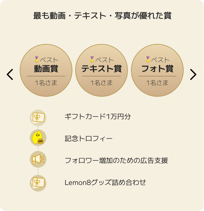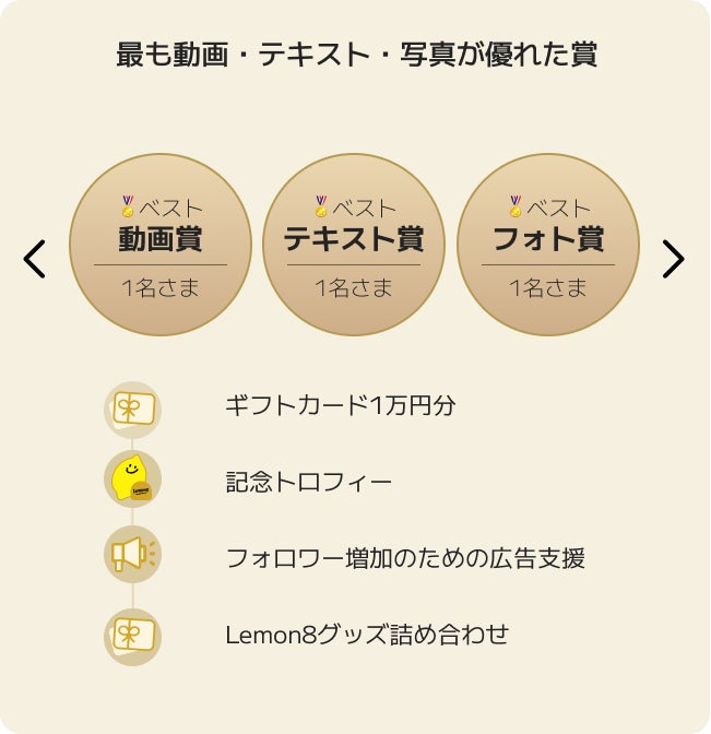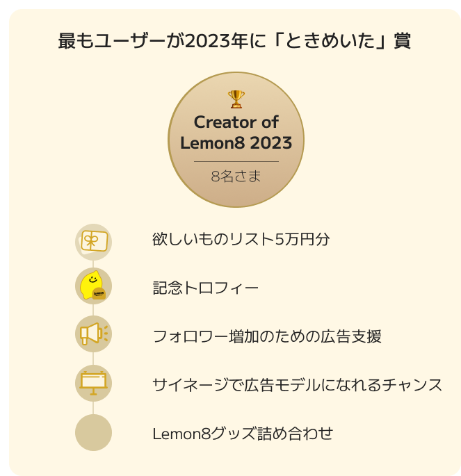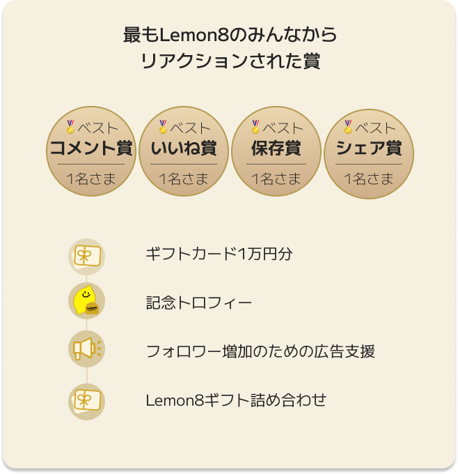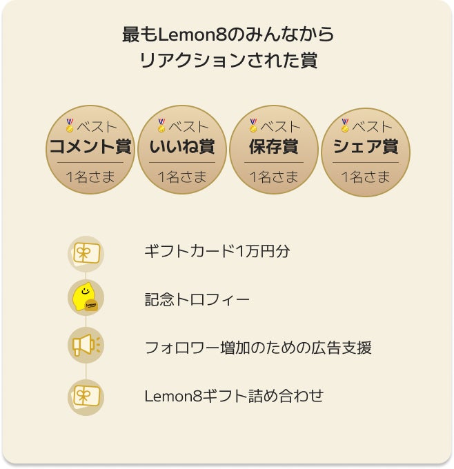 そのなかでLemon8ユーザーが投票で選ぶ特別賞「Creator of Lemon8 」と、その他8項目の賞(ベスト動画賞・ベストフォトテキスト賞・ベストコメント賞・ベスト保存賞・ベストシェア賞・ベストいいね賞・ベスト役立ち賞 )の受賞者を2023年12月22日に発表いたします。