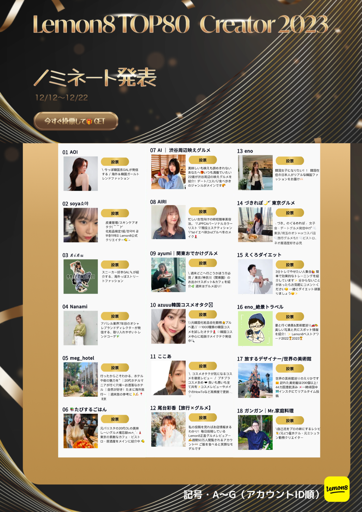 みなさんの投票によって「Lemon8 TOP80 Creator 2023」から特別賞「Creator of Lemon8」の8名が決定します。毎日5回までの投票が可能ですので、ぜひ「最もときめいたクリエイター」に投票してください。