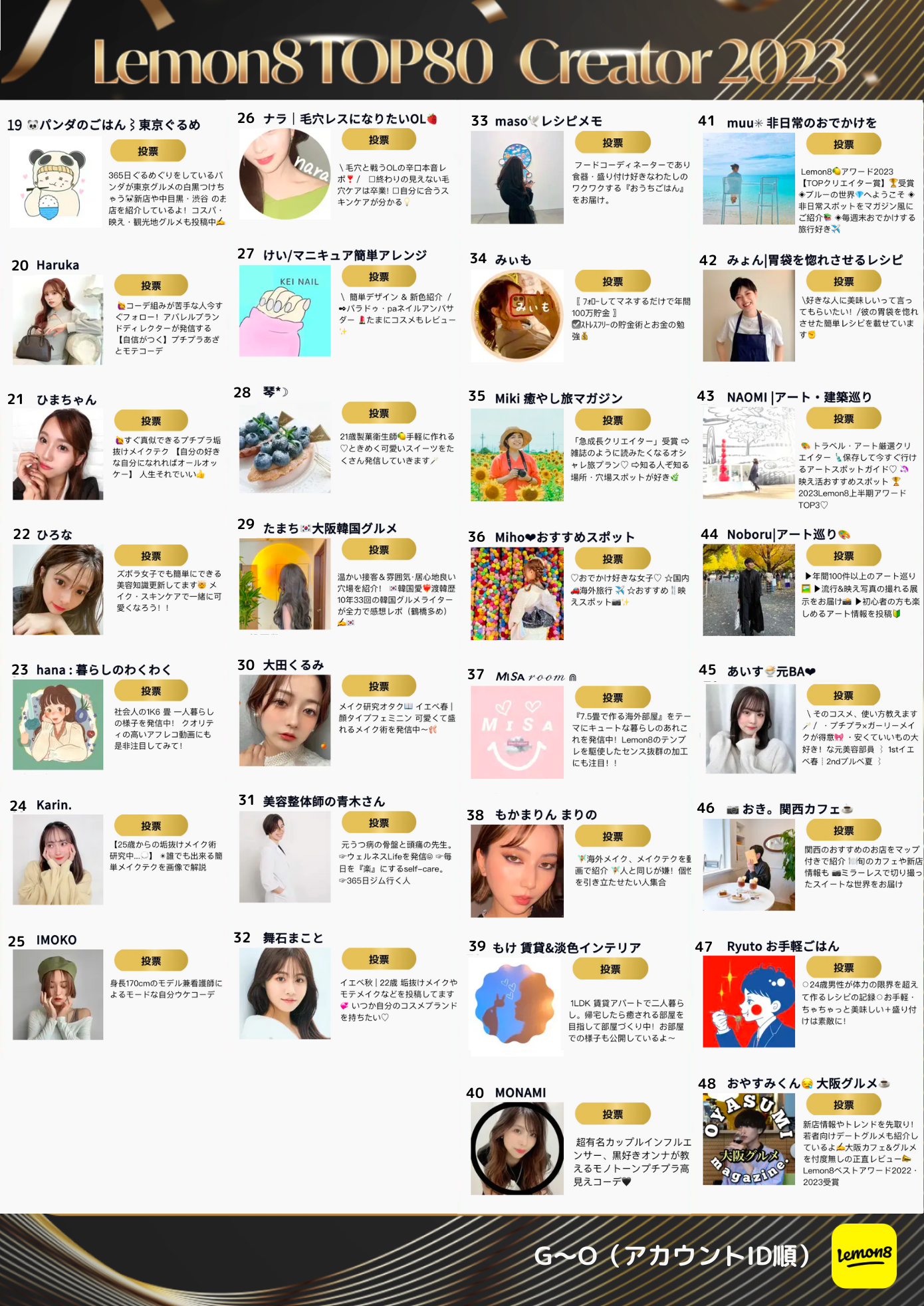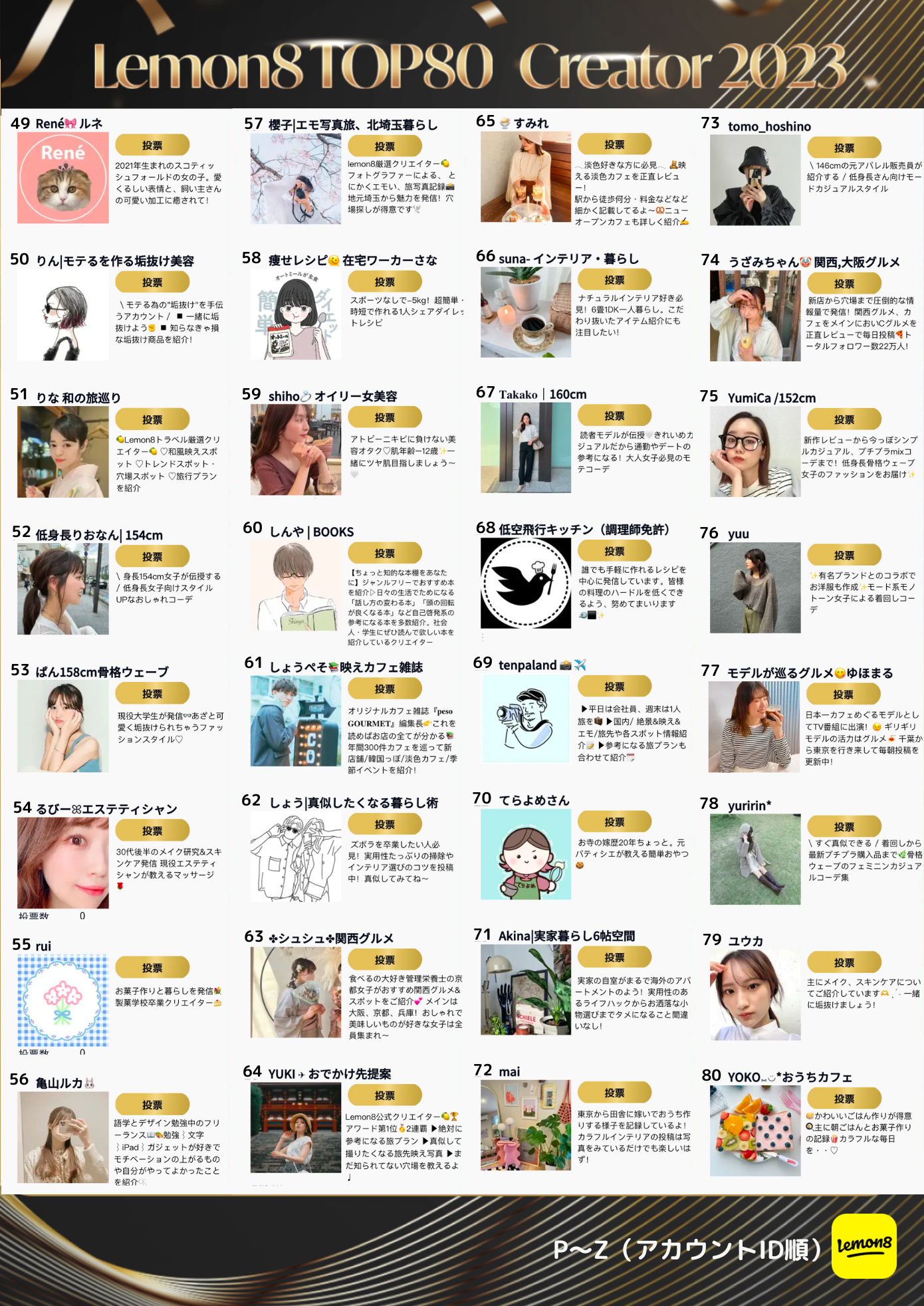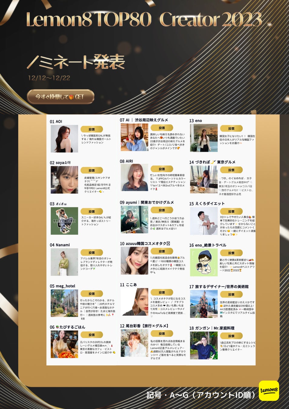 「Lemon8 TOP80 Creator 2023」ノミネート発表: