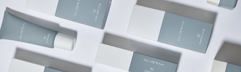 「CLIGRAM]は美容医療と共鳴するコスメシューティカルをテーマに 美容医療の効果を高め、美を最大限に引きだすスキンケアブランドです。「常に美容医療と共に歩む」姿勢をパッケージに投影し、クリニカルなテイストのクールなデザインを採用しました。