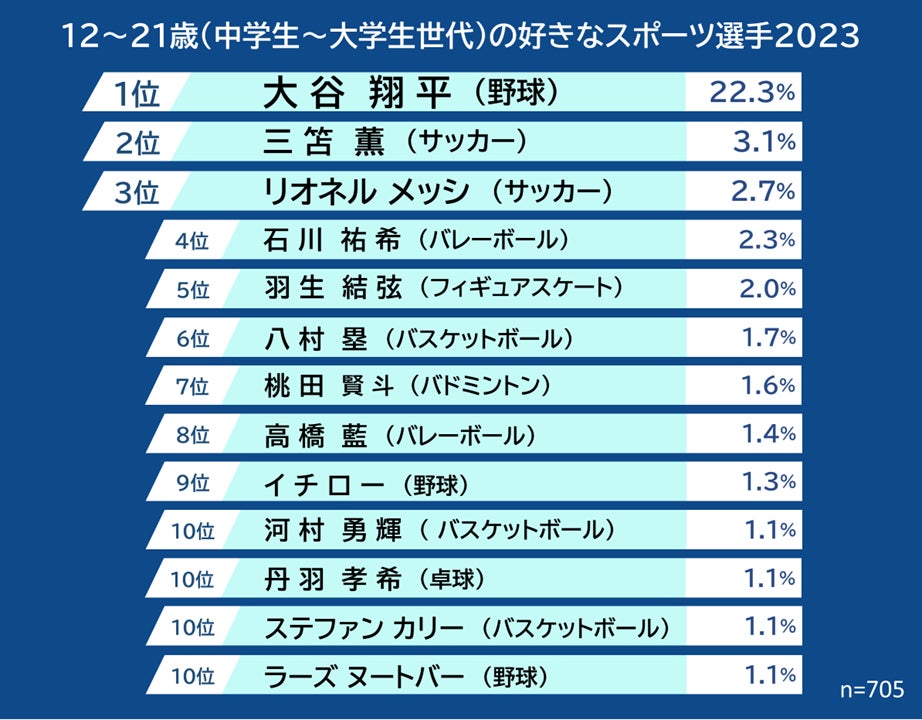 最新!【青少年の 「好きなスポーツ選手」 2023】大谷翔平(野球)が3回連続で1位!過去最多得票率