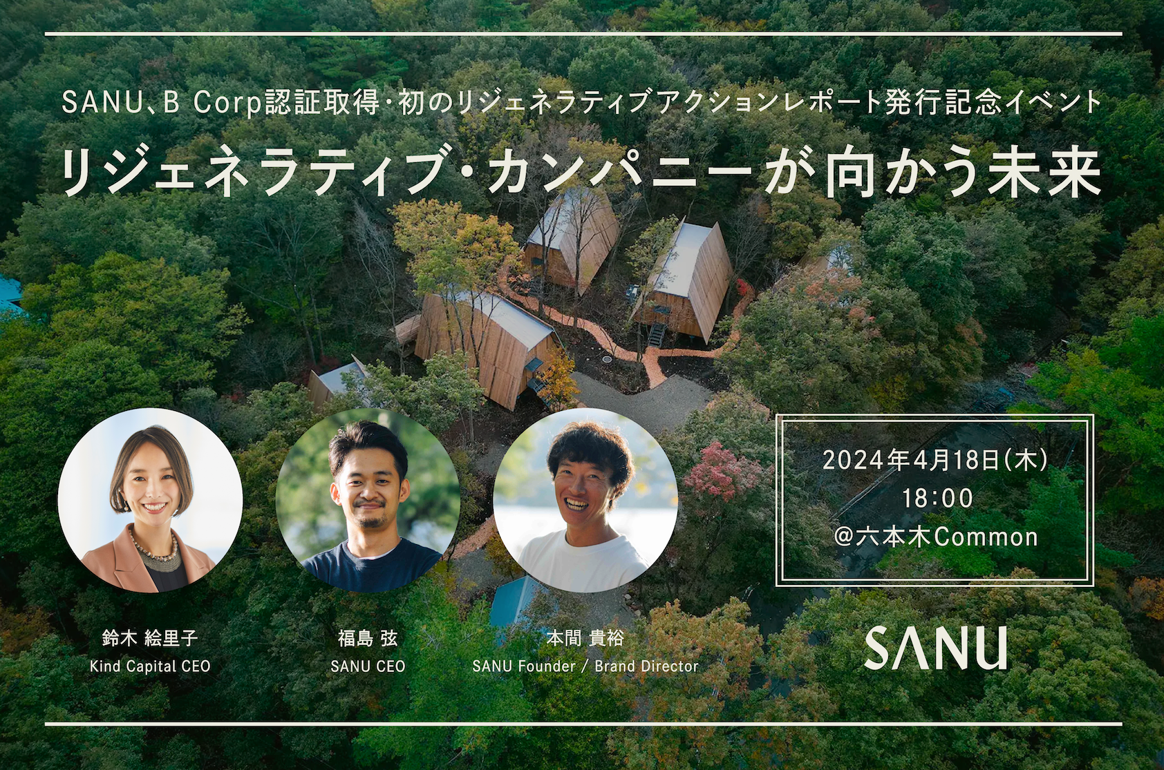 ゲストには、サステナビリティとウェルビーイングに焦点を当てた投資を行うKind CapitalのCEOである鈴木絵里子氏をお招きし、「リジェネラティブ・カンパニーが向かう未来」というテーマでの対談をはじめ、SANUのリジェネラティブに向けた取り組みについて、代表の福島弦からご紹介いたします。