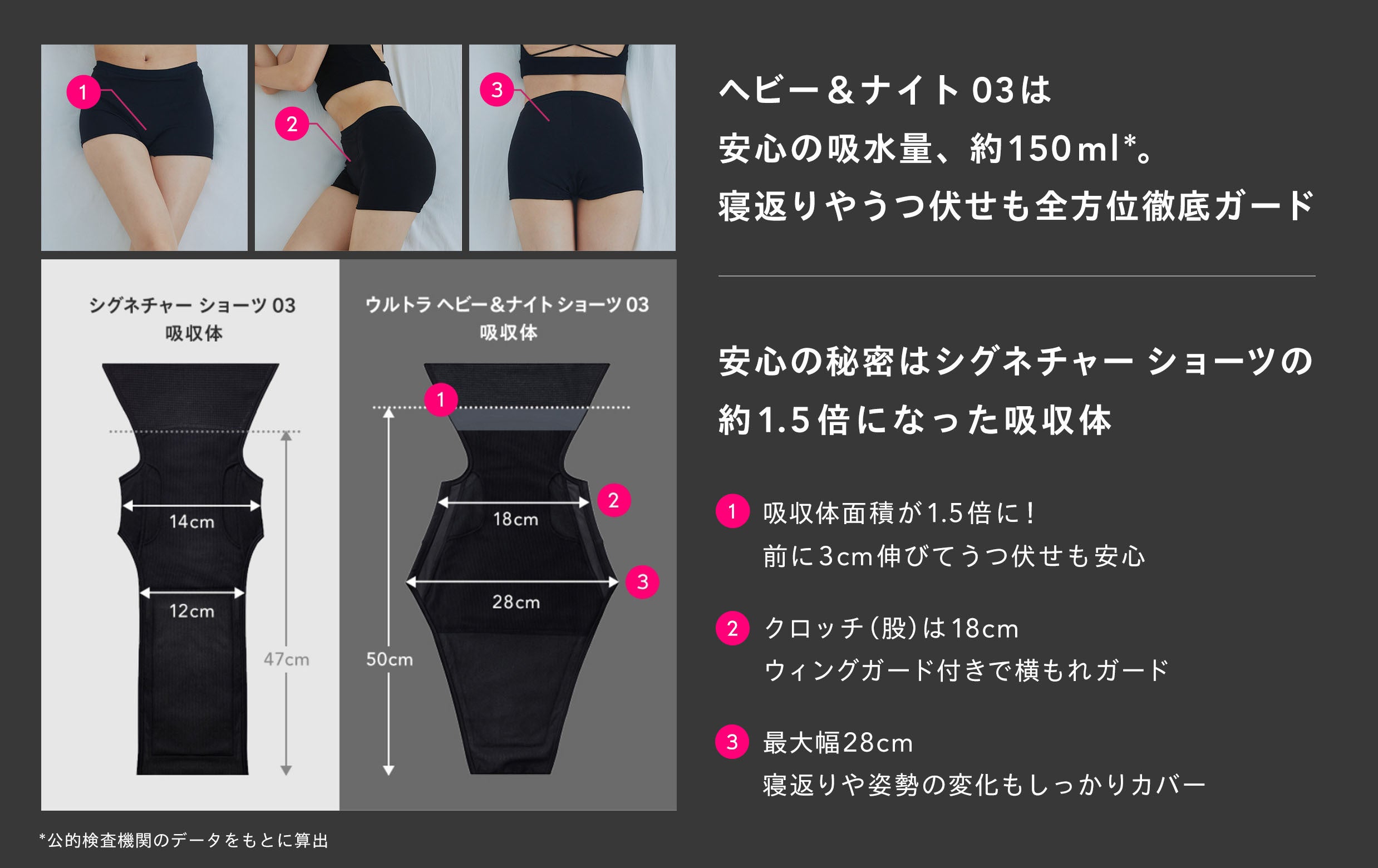 「ベア ウルトラ ヘビー&ナイト ショーツ 03」は、約150ml*の圧倒的な吸水力を実現。 最大幅28cm、長さ50cmの吸収体で前側から腰、ヒップ周りを包みこみます。 全長50㎝の吸収体のクロッチ(股)とヒップ周りを横幅に広げたことにより、前・横・後ろの全方位漏れの不安を解消し、通常の下着を身に着けているのと同じ感覚で着用できます。また、液体を瞬時に吸水するので、肌に触れる部分をサラサラに保ちます。