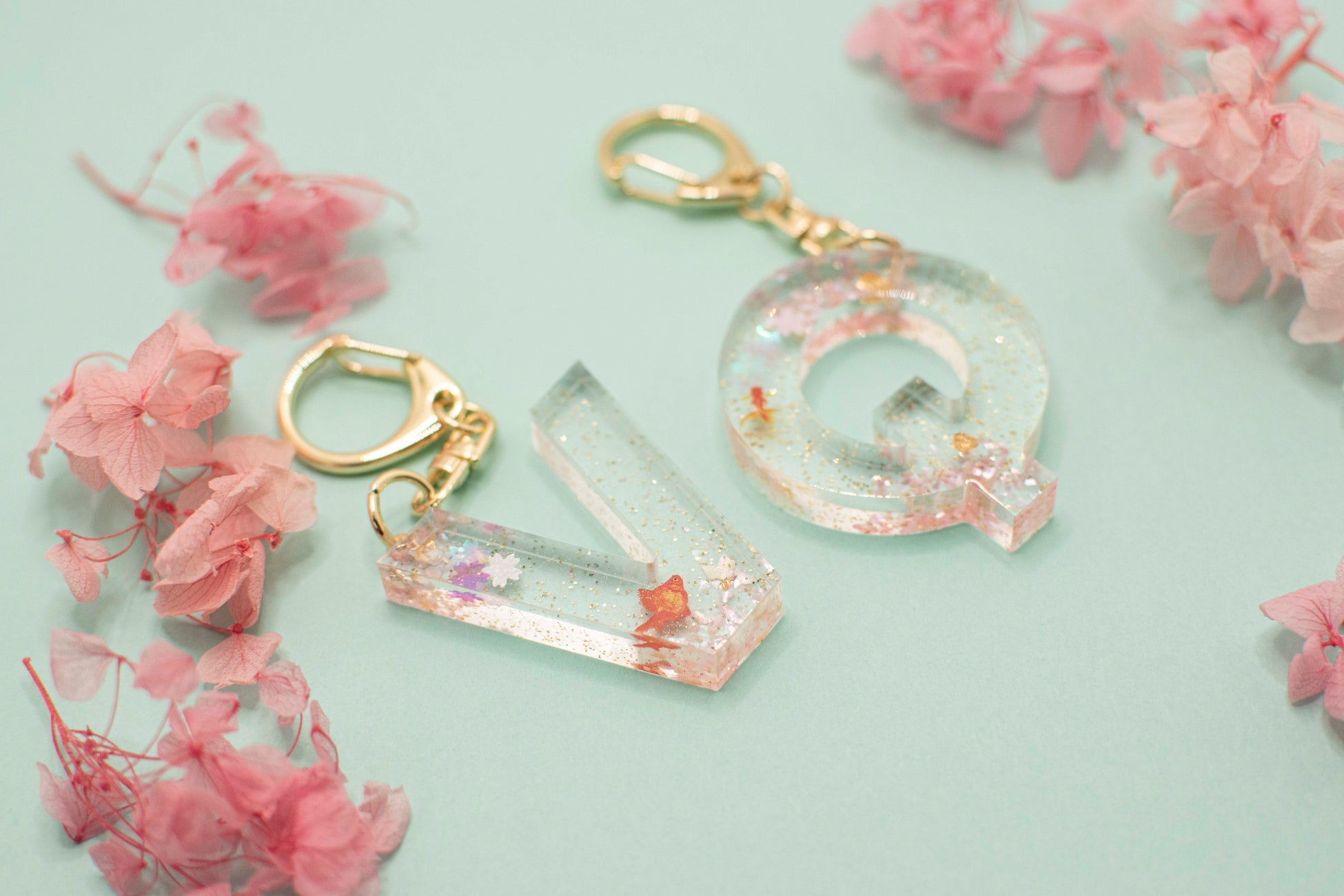 キーホルダーのなかに、金魚と桜の花びら、さらにゴールドのラメが鮮やかに輝くキーホルダー。アルファベットのなかにも広がる“金魚×桜”の春らしい彩りがとっても可愛いキーホルダーです。ご家族や恋人、お友達とお揃いにもぴったり!ぜひご自身のイニシャルも探してみてください。
