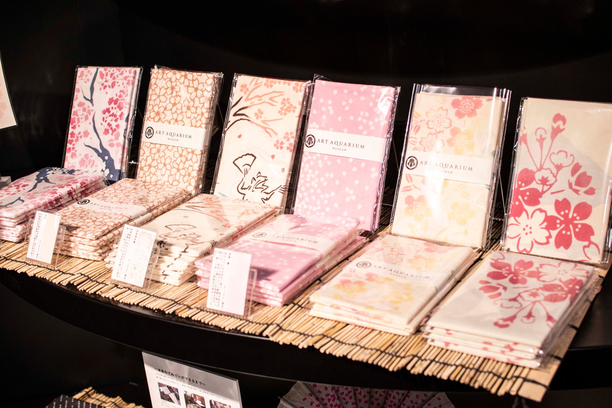 平安時代から使われてきたといわれる、てぬぐい。1967年に代官山でオープンした、てぬぐい専門店「かまわぬ」の商品を金魚柄や季節の絵柄まで多数取り揃えています。春限定で並ぶ桜柄は、館内の作品演出でも表現している八重桜や夜桜などをはじめ約10種類の柄をご用意。