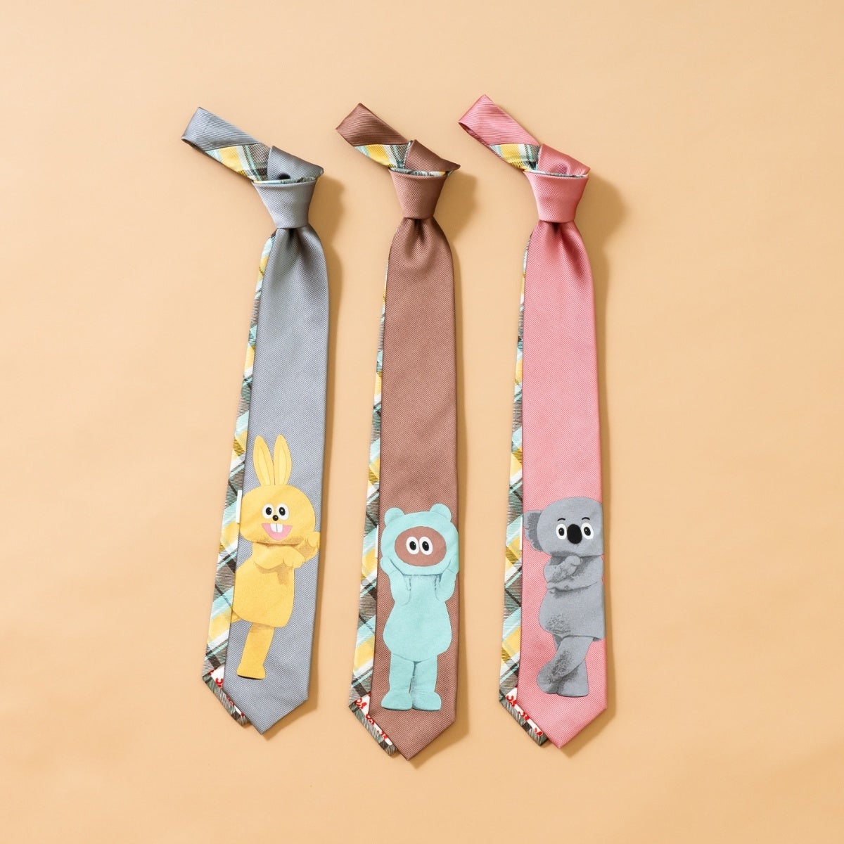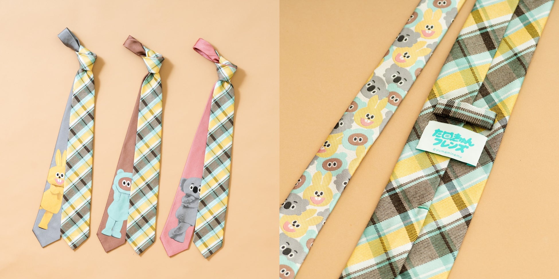 ・giraffe×たぬきゅんフレンズ リバーシブルチェックタイ(たぬきゅんBROWN/ラビやんGRAY/コアラさんPINK)¥17,600(税込)
