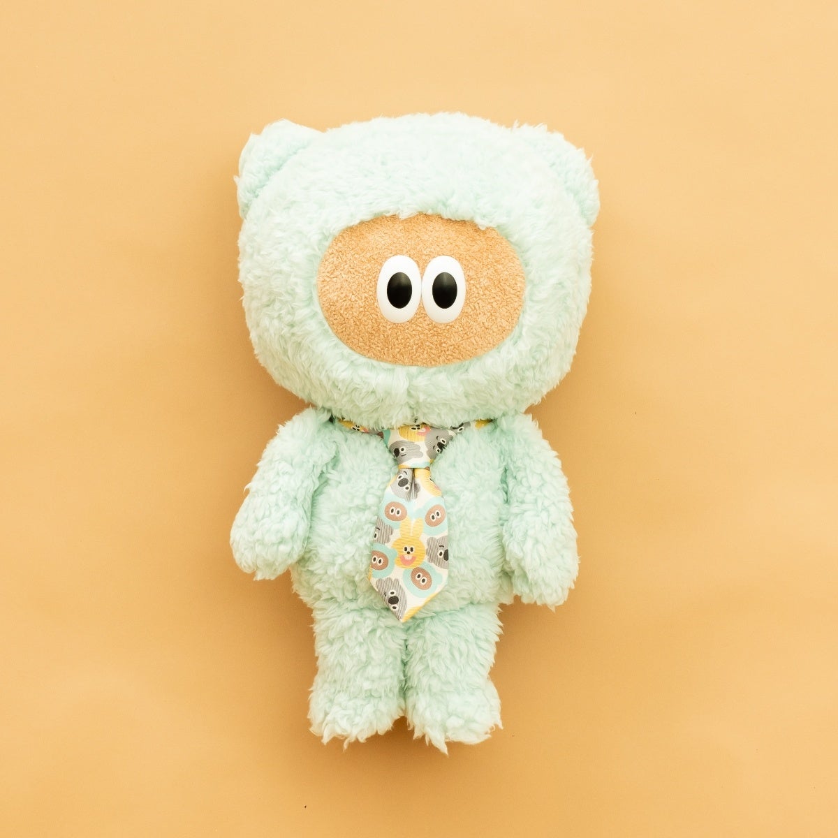 たぬきゅんフレンズの総柄生地で仕立てたミニネクタイは、ぬいぐるみ用としてたぬきゅんたちとお揃いのコーデを楽しむのも良し。3才前後の子どもたちも身に着けられるサイズとなっているので、親子でのお揃いコーデもおすすめです。