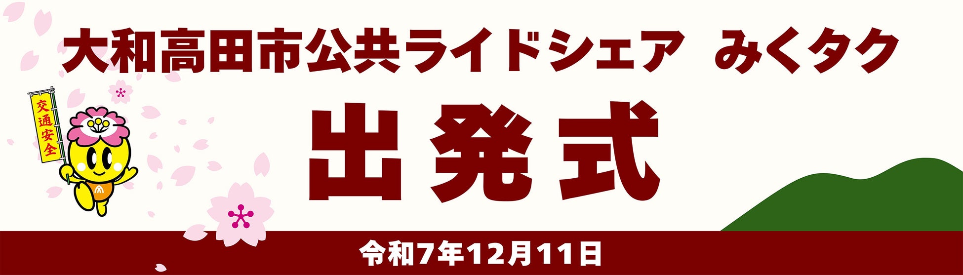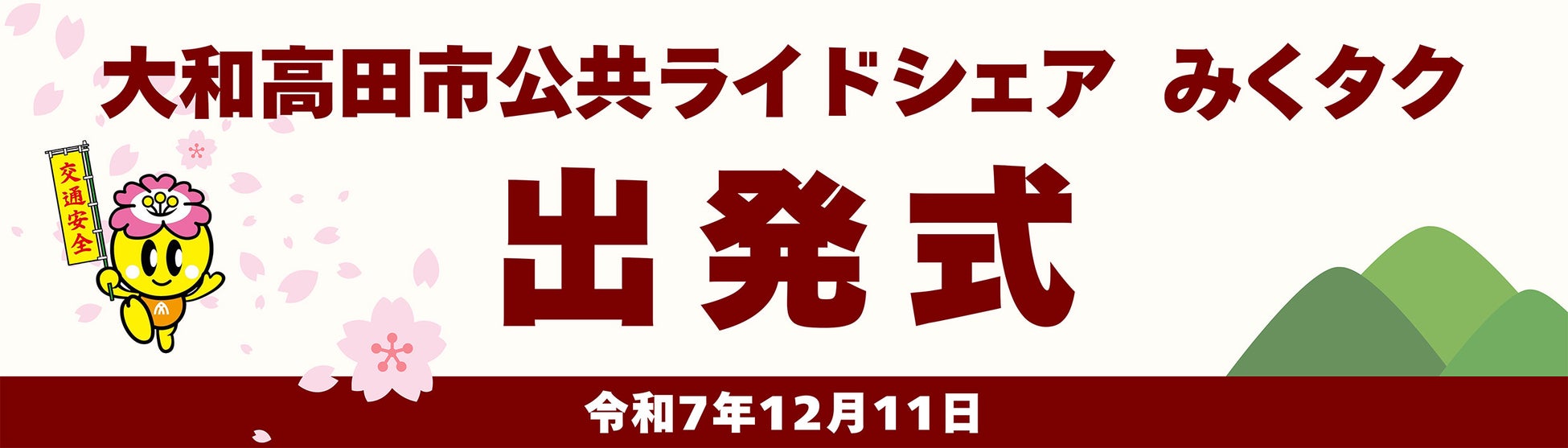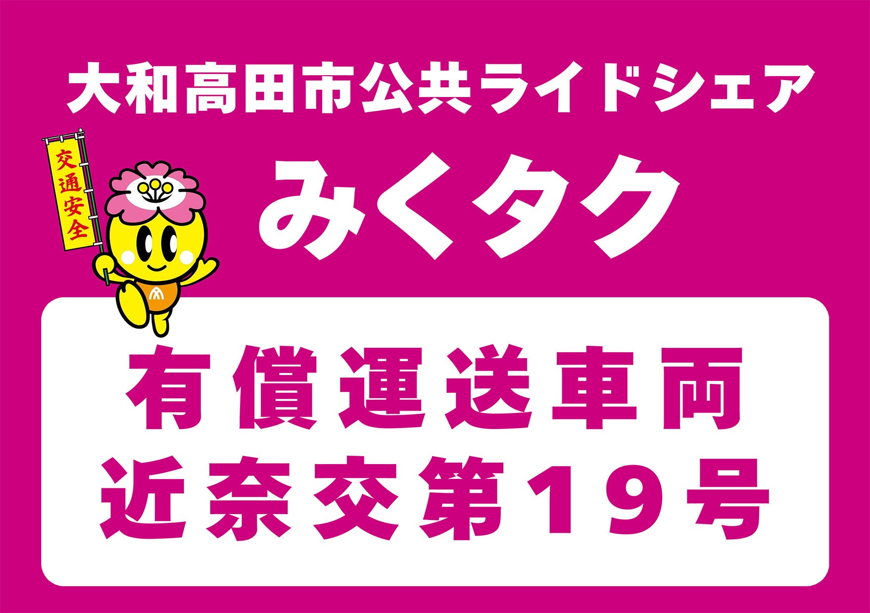 愛称『みくタク』は、大和高田市マスコットキャラクター「みくちゃん」に込められた“大和高田市が未来へはばたきますように”という願いと、住民がドライバーとして支え合う“みんなで支える地域のくらし”という共助の精神を重ね合わせた「みく」、そしてタクシー事業者との共同運営・タクシー優先配車という設計から“タクシーを想起させる”「タク」を組み合わせたものです。タクシーの運賃水準・優先配車により既存公共交通の維持と共存を図ります。