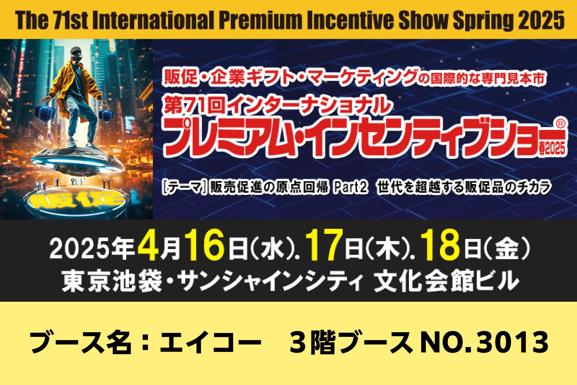 株式会社エイコー(本社:東京都墨田区)は、 2025年4月16日(水)〜4月18日(金)に東京池袋・サンシャインシティ 文化会館ビル コンベンションセンターにて開催される、販促・企業ギフト・マーケティングの国際的な専門見本市「第71回インターナショナルプレミアム・インセンティブショー春2025」(主催:株式会社ビジネスガイド社)に出展することをお知らせいたします。
