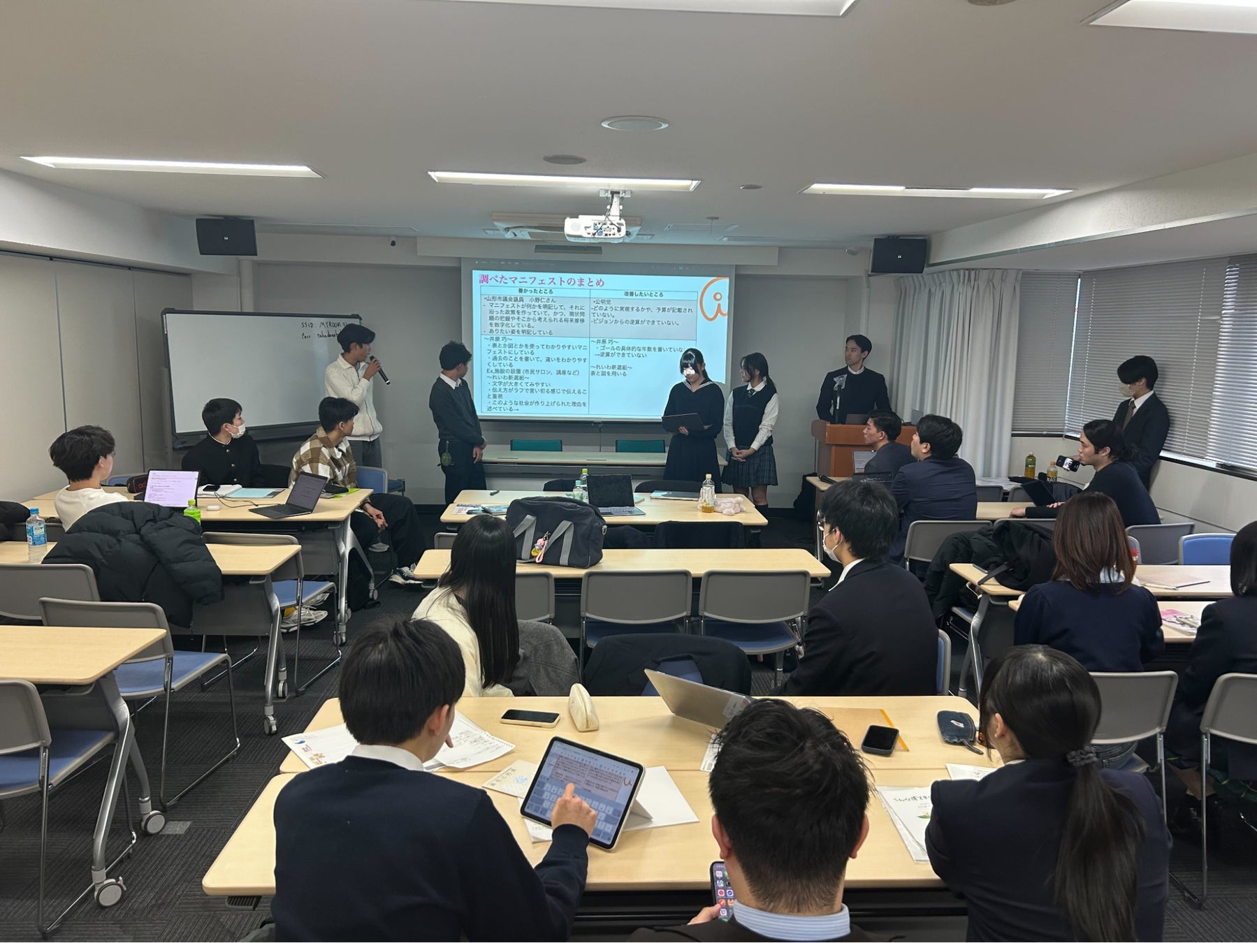 マニフェストの成り立ちや役割、政策を読み解く際の視点について生徒に解説。単なる公約の一覧ではなく、「検証可能な約束」としてマニフェストを捉える考え方を学びました。