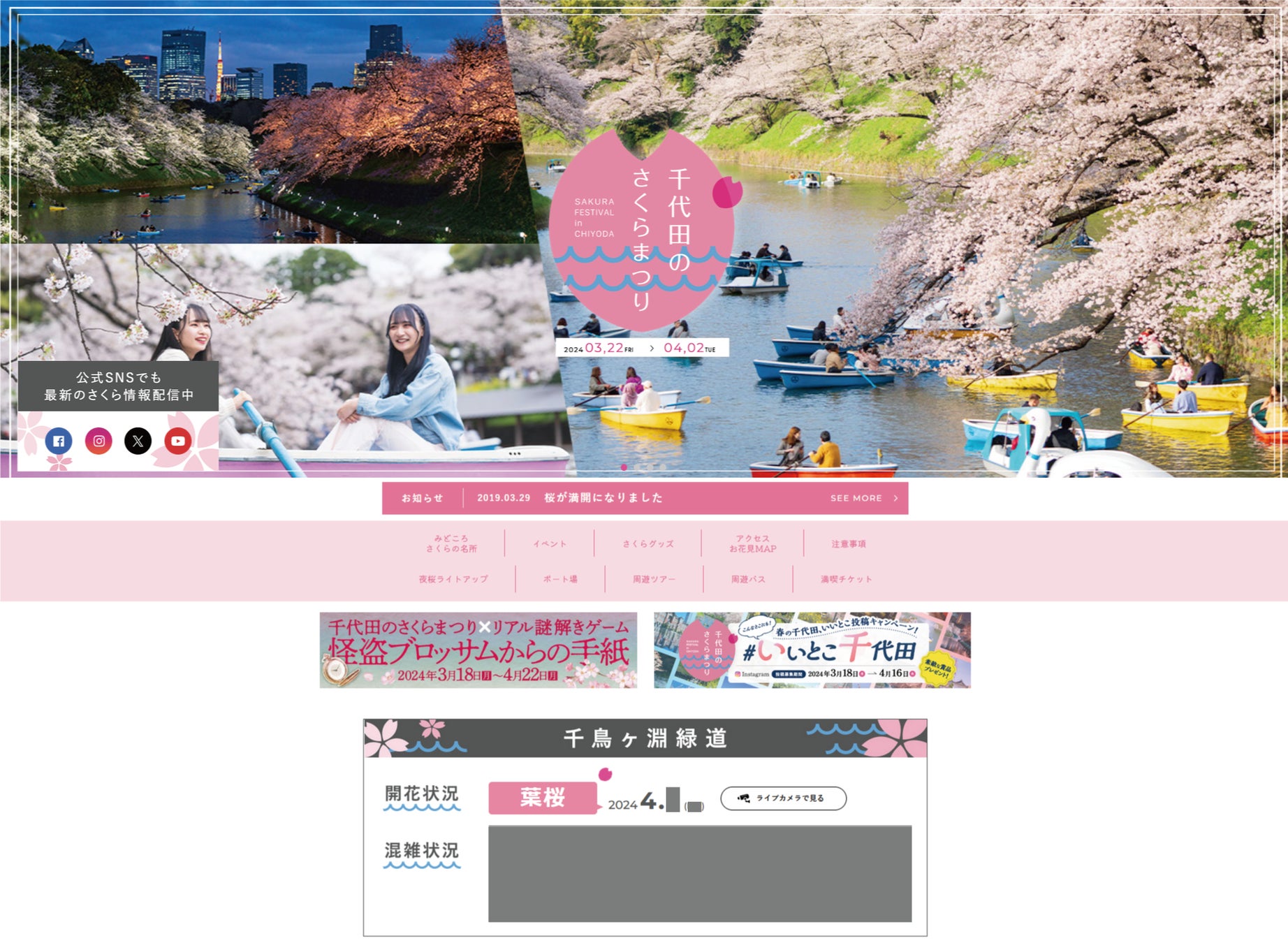 千代田区観光協会のウェブサイトで、「千代田のさくらまつり特設サイト」を公開します。おすすめの桜スポットや期間中の関連イベントを掲載するほか、ボート場屋上に設置したライブカメラ等で桜の開花状況を見ることができます。またさくらまつり期間中の千鳥ヶ淵緑道の混雑状況なども発信します。