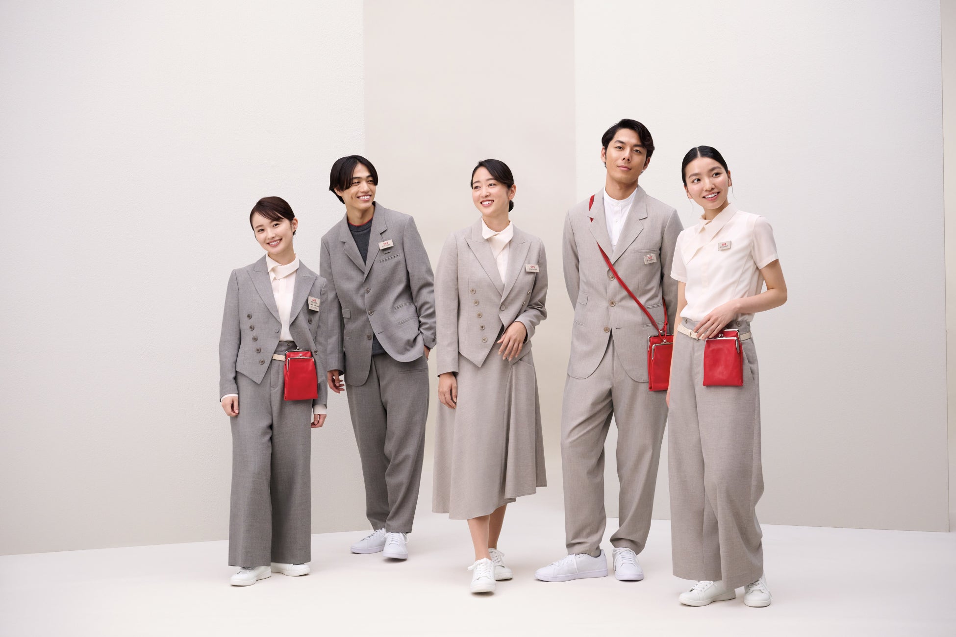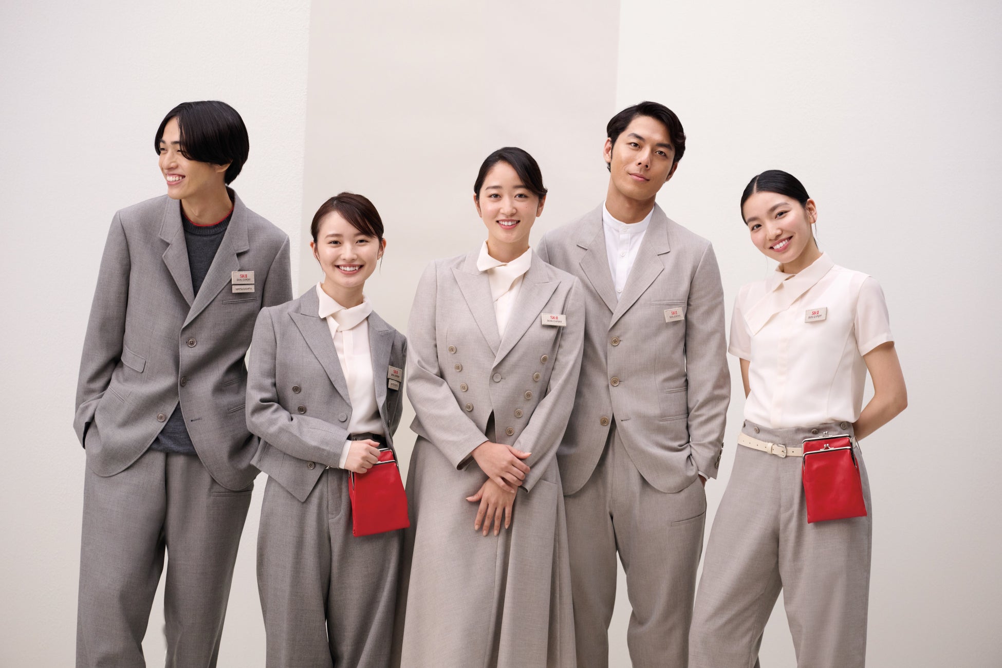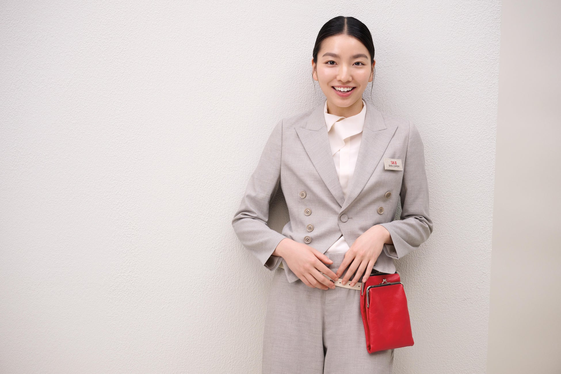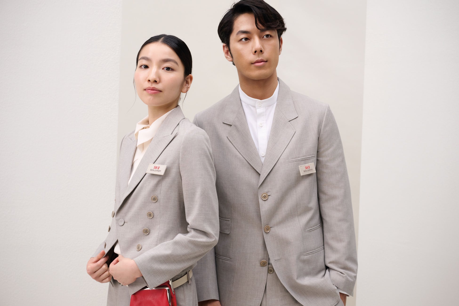 Y'sの特性、SK-IIのカラー、上品でいて存在感のある遊び心を表現しました。Y'sらしいドレープや、女性服に表現するメンズ服の要素──メンズ服の正装であるスペンサージャケットをベースにしたジャケット。パンツのウエスト部分にサスペンダー仕様のボタンを付けたままにしたデザインディテール。アシンメトリーフォルムのスカート。襟にドレープが入り、スカーフを纏っているような見え方になった特徴的なシャツ。ベージュと白でつくられたY'sのシルエットに、SK-IIを象徴する赤が首元や腰のポーチに差し込まれ、刷新された制服のスタイルが完成します。男性スタッフの制服も、Y'sらしいシルエットのジャケットとパンツで描かれ、布と刺繍で表現されたユニークなネームプレートに至るまでY'sらしい表現が一貫して表現されています。